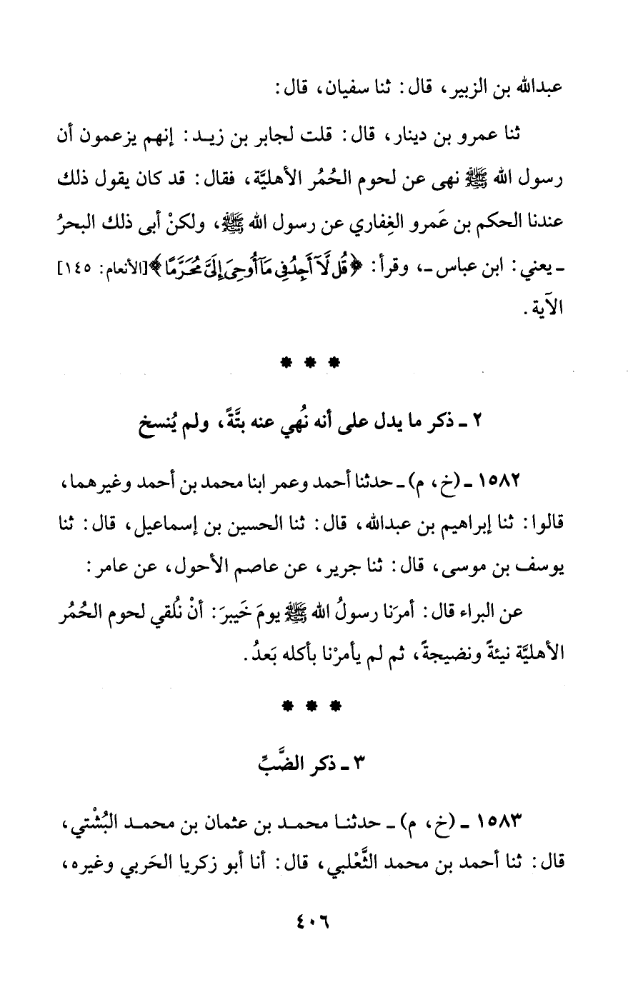 1582 - (خ، م) - حدثنا أحمد وعمر ابنا محمد بن أحمد وغيرهما، قالوا: ثنا إبراهيم بن عبد الله، قال: ثنا الحسين بن إسماعيل، قال: ثنا يوسف بن موسى، قال: ثنا جرير، عن عاصم الأحول، عن عامر: