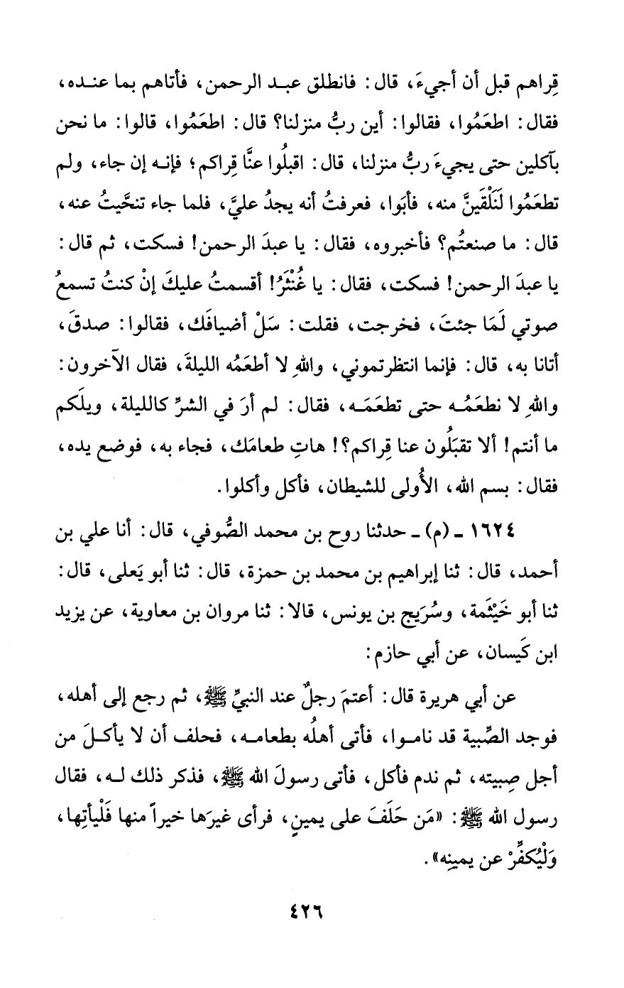 عن أبي هريرة قال: أعتم رجل عند النبي صلى الله عليه وسلم، ثم رجع إلى أهله، فوجد الصبية قد ناموا، فأتى أهله بطعامه، فحلف أن لا يأكل من أجل صبيته، ثم ندم فأكل، فأتى رسول الله صلى الله عليه وسلم، فذكر ذلك له، فقال رسول الله صلى الله عليه وسلم: ((من حلف على يمين، فرأى غيرها خيرا منها فليأتها، وليكفر عن يمينه)).
