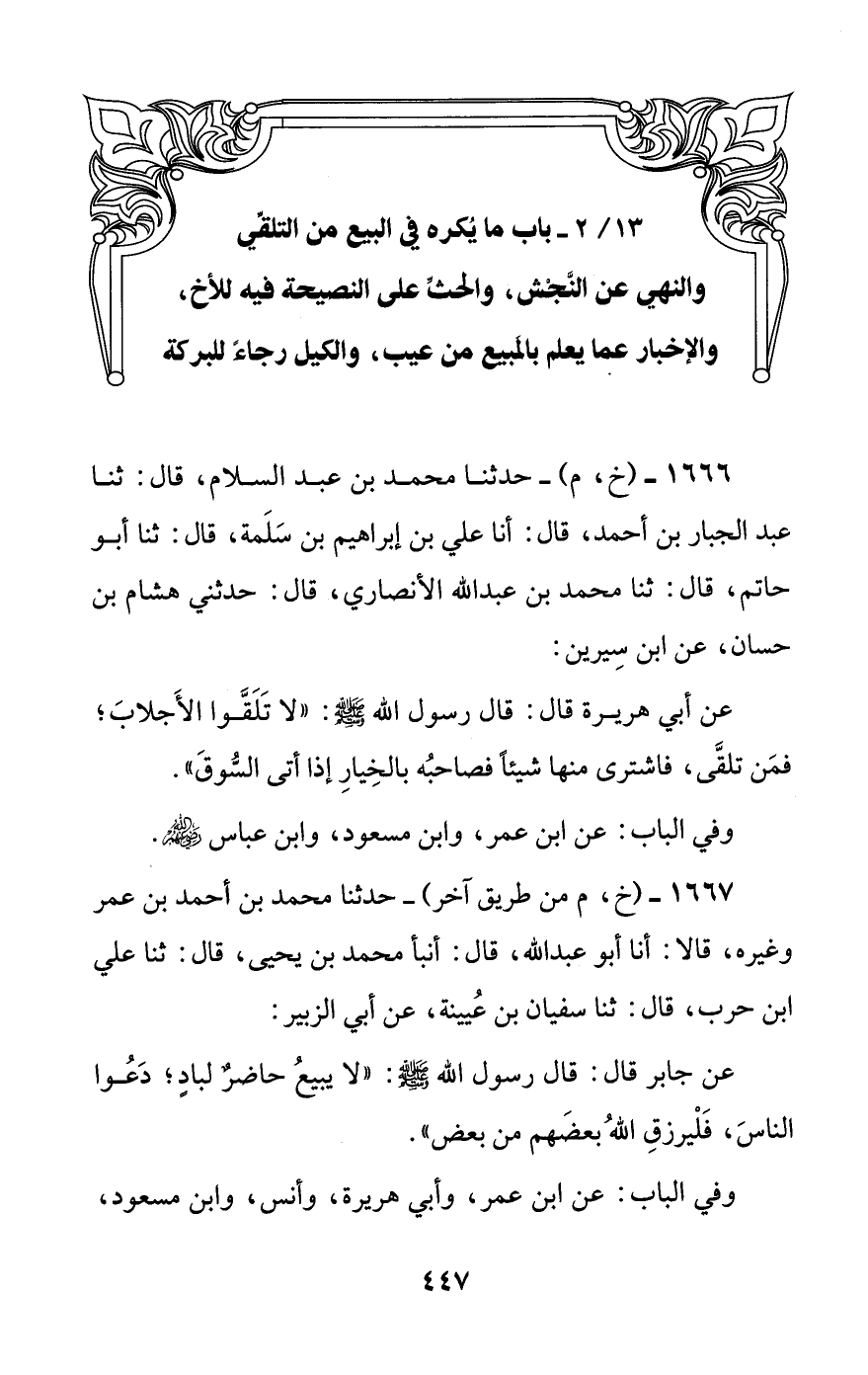 [13/ 2] باب ما يكره في البيع من التلقي والنهي عن النجش، والحث على النصيحة فيه للأخ، والإخبار عما يعلم بالمبيع من عيب، والكيل رجاء للبركة