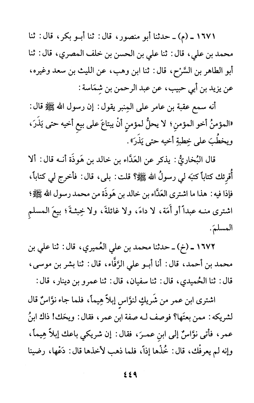 قال البخاري: يذكر عن العداء بن خالد بن هوذة أنه قال: ألا أقرئك كتابا كتبه لي رسول الله صلى الله عليه وسلم؟ قلت: بلى، قال: فأخرج لي كتابا، فإذا فيه: هذا ما اشترى العداء بن خالد بن هوذة من محمد رسول الله صلى الله عليه وسلم؛ اشترى منه عبدا أو أمة، لا داء، ولا غائلة، ولا خبثة؛ بيع المسلم المسلم.