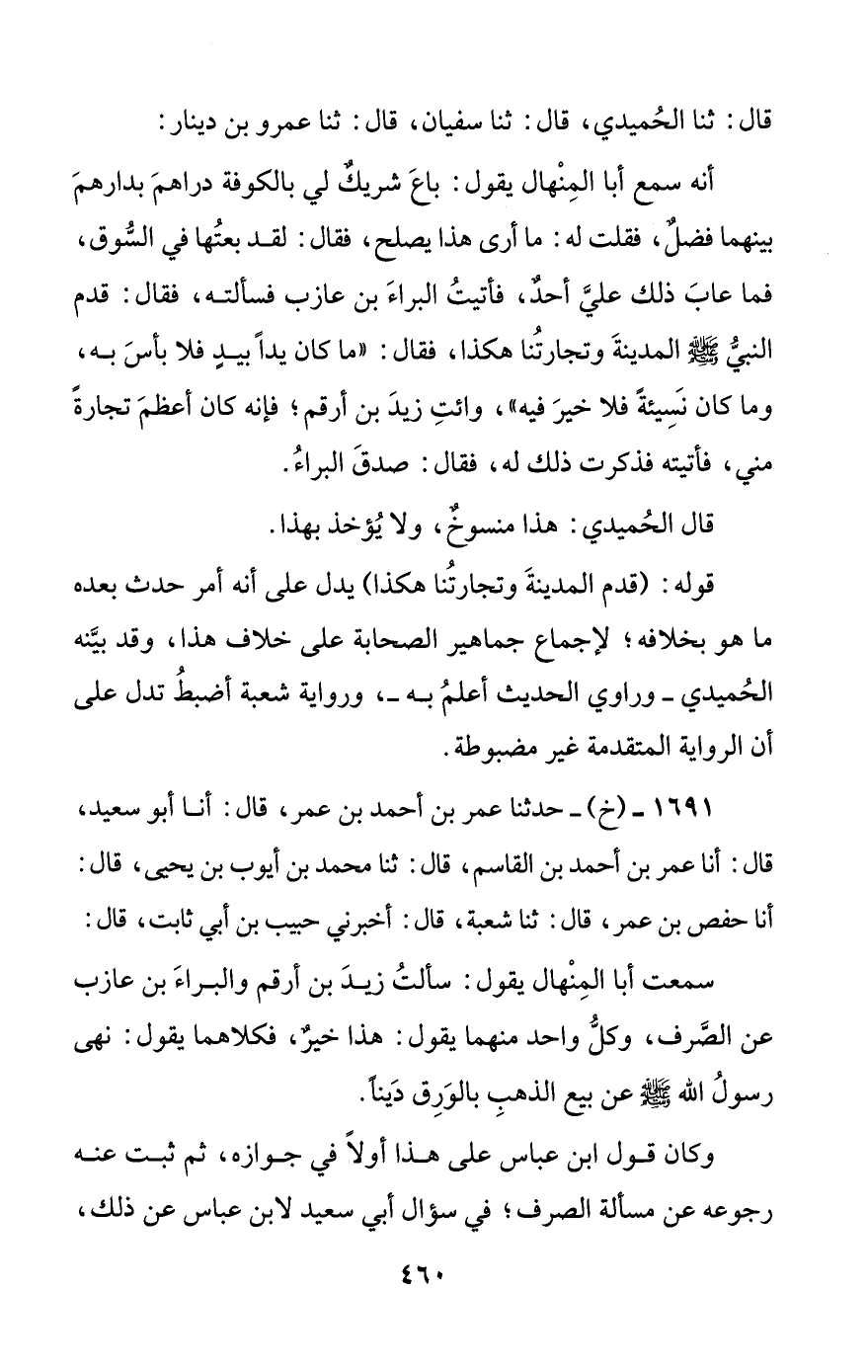 سمعت أبا المنهال يقول: سألت زيد بن أرقم والبراء بن عازب عن الصرف، وكل واحد منهما يقول: هذا خير، فكلاهما يقول: نهى رسول الله صلى الله عليه وسلم عن بيع الذهب بالورق دينا.