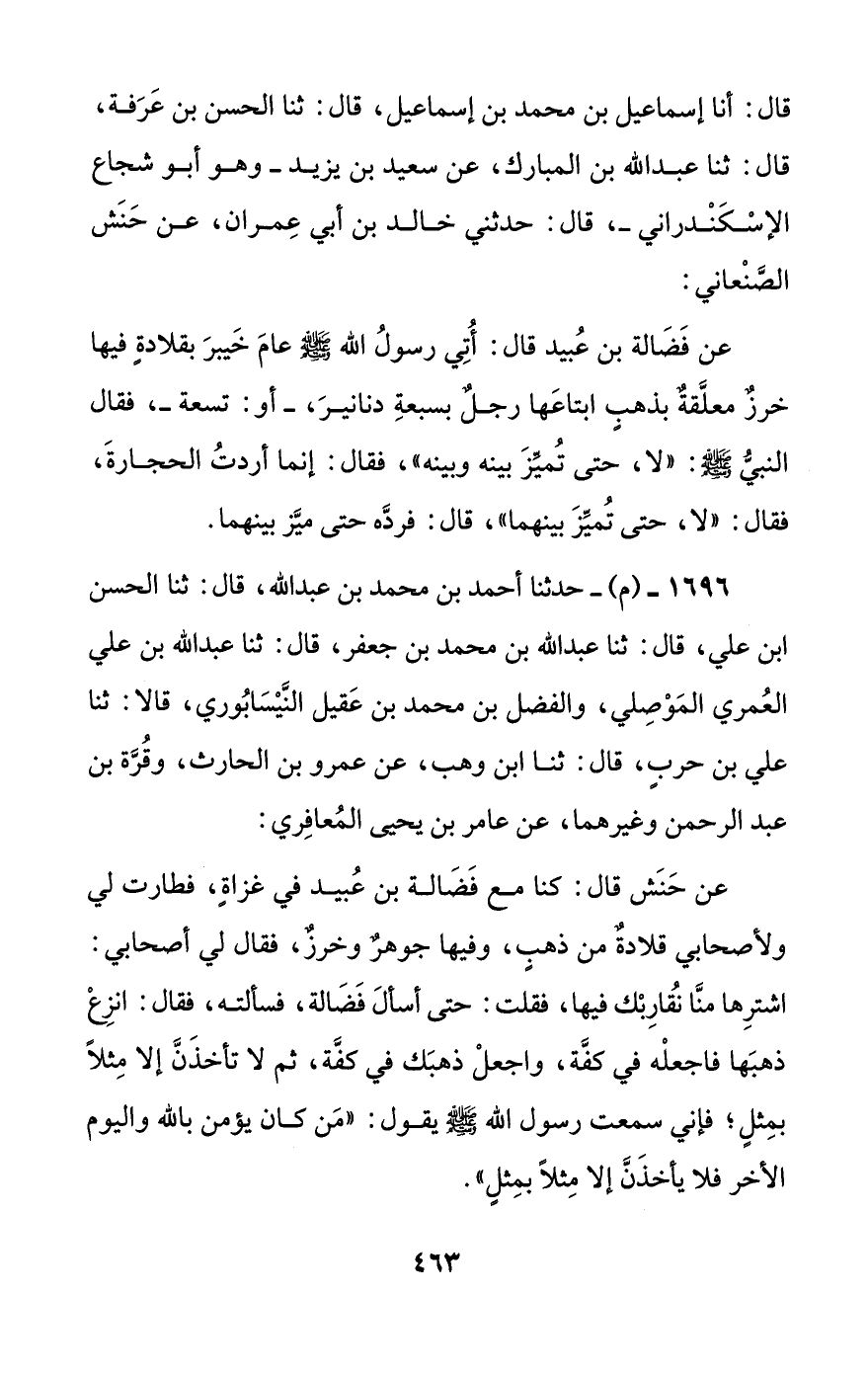 عن حنش قال: كنا مع فضالة بن عبيد في غزاة، فطارت لي ولأصحابي قلادة من ذهب، وفيها جوهر وخرز، فقال لي أصحابي: اشترها منا نقاربك فيها، فقلت: حتى أسأل فضالة، فسألته، فقال: انزع ذهبها فاجعله في كفه، واجعل ذهبك في كفه، ثم لا تأخذن إلا مثلا بمثل؛ فإني سمعت رسول الله صلى الله عليه وسلم يقول: ((من كان يؤمن بالله واليوم الأخر فلا يأخذن إلا مثلا بمثل)).