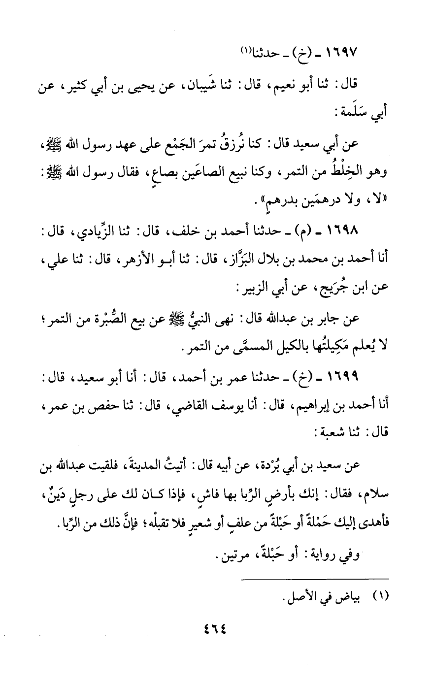 1699 - (خ) - حدثنا عمر بن أحمد، قال: أنا أبو سعيد، قال: أنا أحمد بن إبراهيم، قال: أنا يوسف القاضي، قال: ثنا حفص بن عمر، قال: ثنا شعبة: