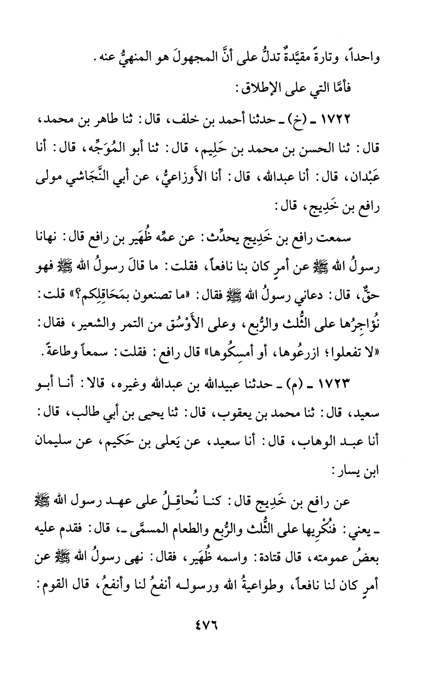 عن رافع بن خديج قال: كنا نحاقل على عهد رسول الله صلى الله عليه وسلم –يعني: فنكريها على الثلث والربع والطعام المسمى-، قال: فقدم عليه بعض عمومته، قال قتادة: واسمه ظهير، فقال: نهى رسول الله صلى الله عليه وسلم عن أمر كان لنا نافعا، وطواعية الله ورسوله أنفع لنا وأنفع، قال القوم: #477# وما ذاك؟ قال: قال رسول الله صلى الله عليه وسلم: ((من كانت له أرض فليزرعها، أو ليزرعها أخاه، ولا يكارها بالثلث ولا بالربع ولا طعام مسمى)).