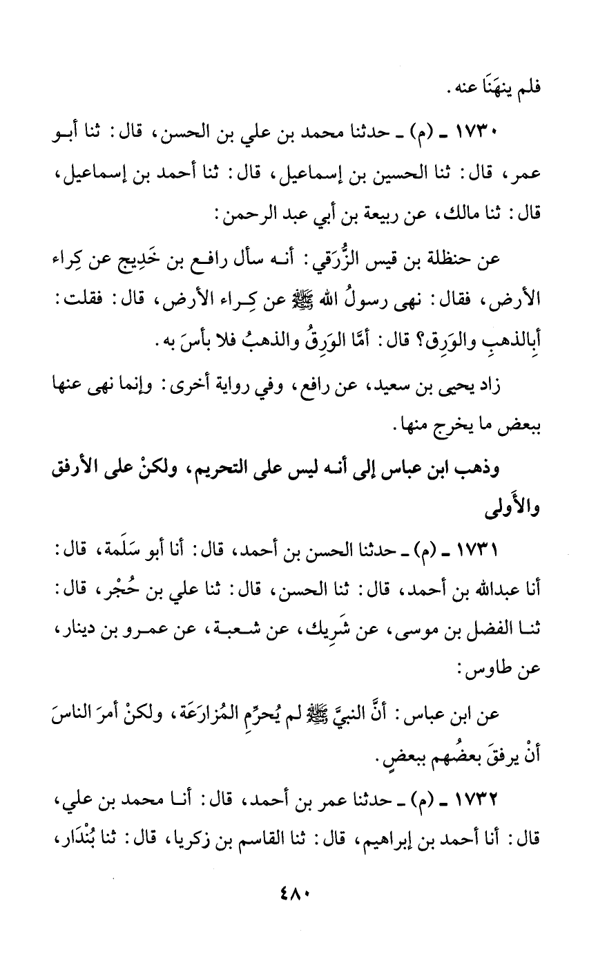 1731 - (م) - حدثنا الحسن بن أحمد، قال: أنا أبو سلمة، قال: أنا عبد الله بن أحمد، قال: ثنا الحسن، قال: ثنا علي بن حجر، قال: ثنا الفضل بن موسى، عن شريك، عن شعبة، عن عمرو بن دينار، عن طاوس: