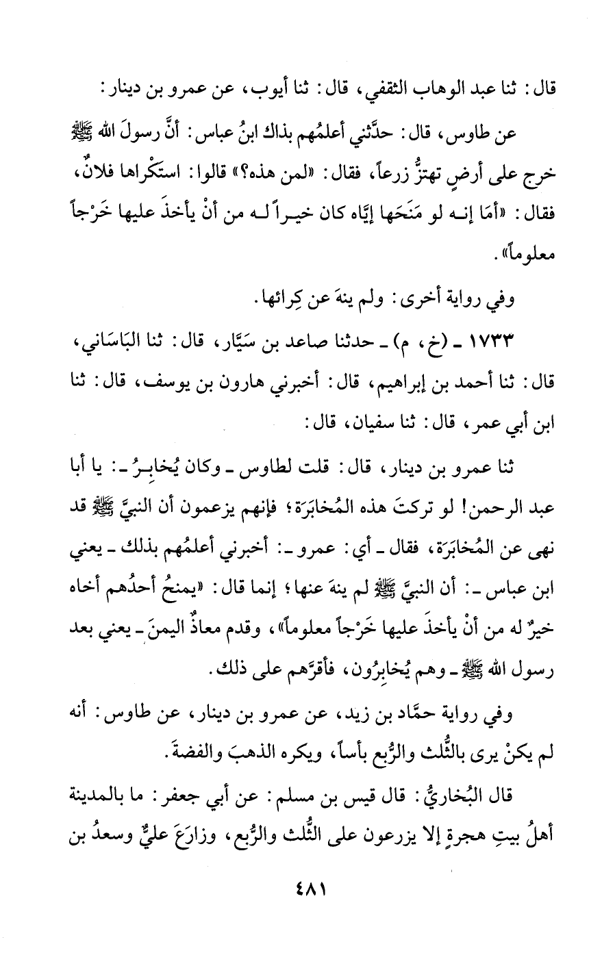 ثنا عمرو بن دينار، قال: قلت لطاوس –وكان يخابر-: يا أبا عبد الرحمن! لو تركت هذه المخابرة؛ فإنهم يزعمون أن النبي صلى الله عليه وسلم قد نهى عن المخابرة، فقال –أي: عمرو-: أخبرني أعلمهم بذلك –يعني ابن عباس-: أن النبي صلى الله عليه وسلم لم ينه عنها؛ إنما قال: ((يمنح أحدهم أخاه خير له من أن يأخذ عليها خرجا معلوما))، وقدم معاذ اليمن –يعني بعد رسول الله صلى الله عليه وسلم- وهم يخابرون، فأقرهم على ذلك.