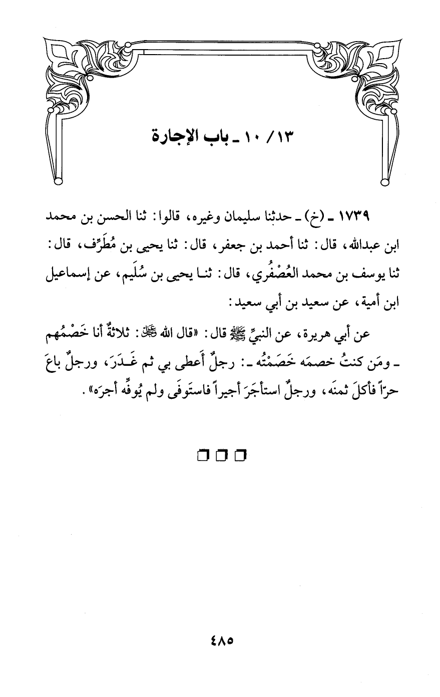 عن أبي هريرة، عن النبي صلى الله عليه وسلم قال: ((قال الله عز وجل: ثلاثة أنا خصمهم –ومن كنت خصمه خصمته-: رجل أعطى بي ثم غدر، ورجل باع حرا فأكل ثمنه، ورجل استأجر أجيرا فاستوفى ولم يوفه أجره)).