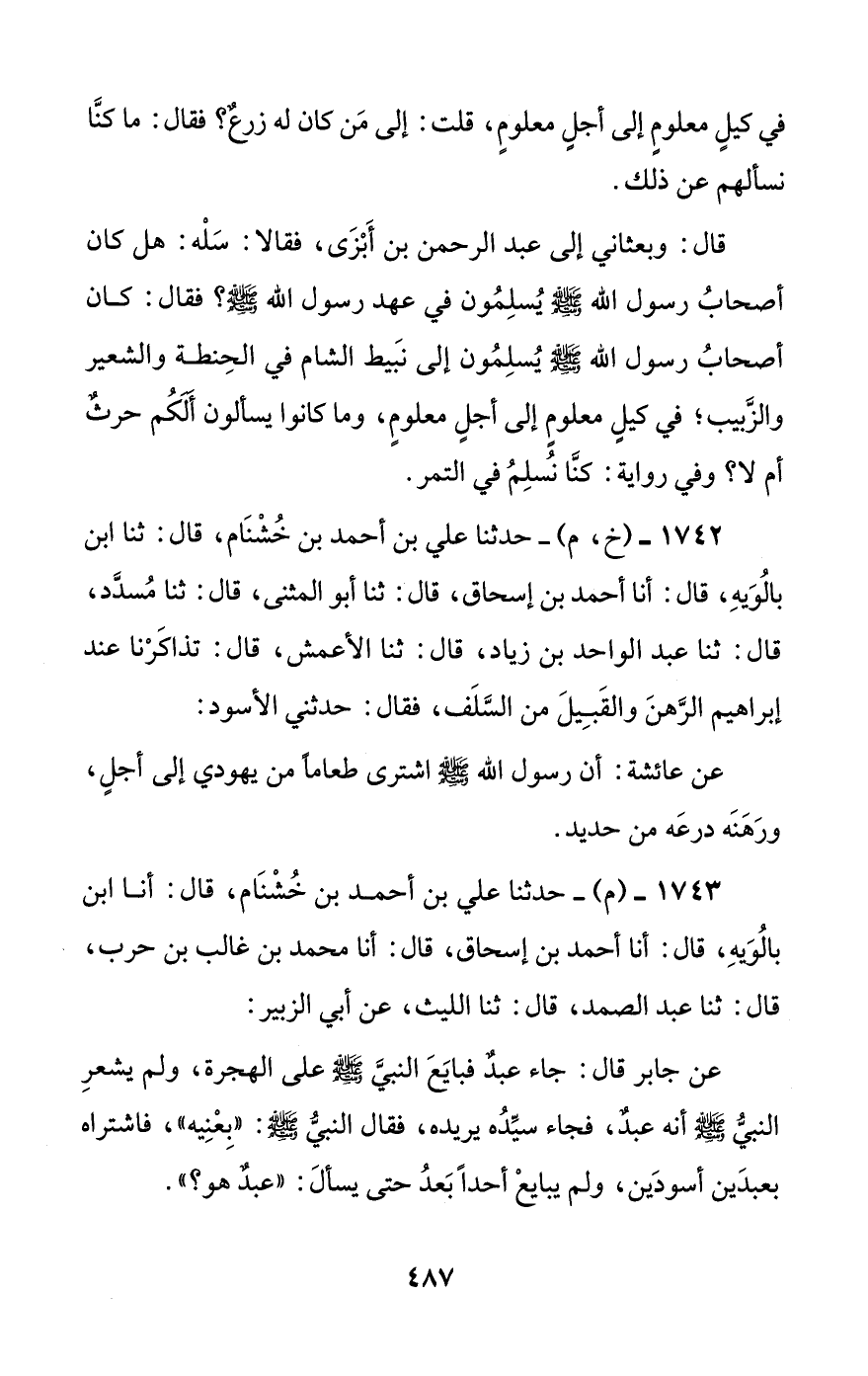 1742 - (خ، م) - حدثنا علي بن أحمد بن خشنام، قال: ثنا ابن بالويه، قال: أنا أحمد بن إسحاق، قال: ثنا أبو المثنى، قال: ثنا مسدد قال: ثنا عبد الواحد بن زياد، قال: ثنا الأعمش، قال: تذاكرنا عند إبراهيم الرهن والقبيل من السلف، فقال: حدثني الأسود: