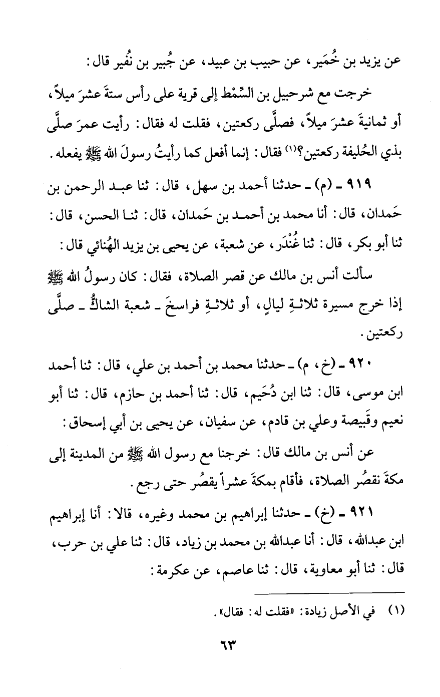 921 - (خ) - حدثنا إبراهيم بن محمد وغيره، قالا: أنا إبراهيم بن عبد الله، قال: أنا عبد الله بن محمد بن زياد، قال: ثنا علي بن حرب، قال: ثنا أبو معاوية، قال: ثنا عاصم، عن عكرمة: #64# عن ابن عباس قال: سافر رسول الله صلى الله عليه وسلم سفرا، فأقام تسعة عشر يوما يصلي ركعتين ركعتين، قال ابن عباس: فنحن نصلي ما بيننا وبين التسع عشرة يوما ركعتين ركعتين، فإذا أقمنا أكثر من ذلك صلينا أربعا.