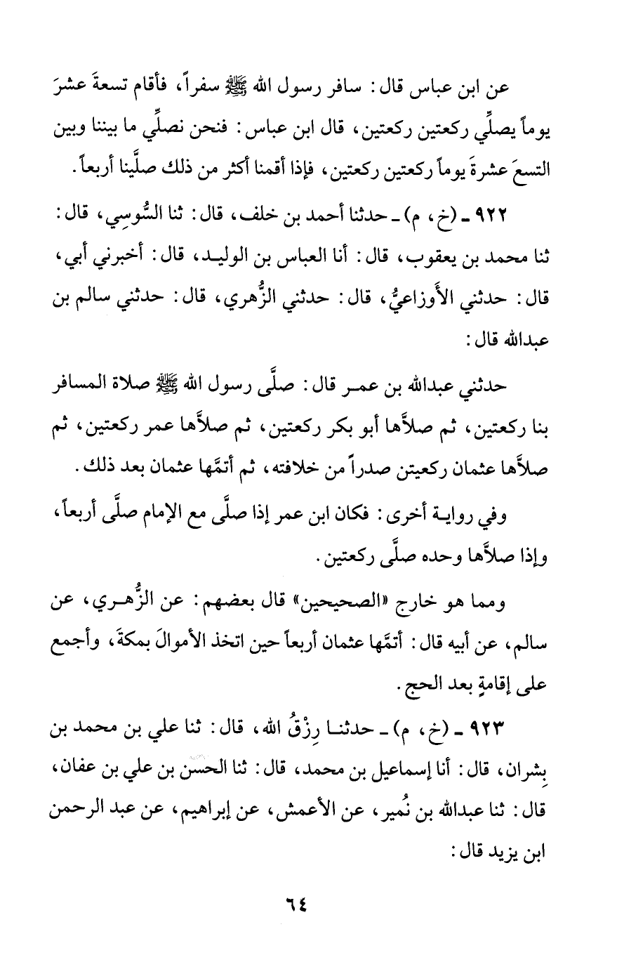 923 - (خ، م) - حدثنا رزق الله، قال: ثنا علي بن محمد بن بشران، قال: أنا إسماعيل بن محمد، قال: ثنا الحسن بن علي بن عفان، قال: ثنا عبد الله بن نمير، عن الأعمش، عن إبراهيم، عن عبد الرحمن بن يزيد قال: #65# قال عبد الله لما رأى عثمان صلى بمنى أربع ركعات: صليت خلف رسول الله ركعتين، وخلف أبي بكر ركعتين، وخلف عمر ركعتين، ثم تفرقت بكم الطرق، فليت حظي من أربع ركعتين متقبلتين.
