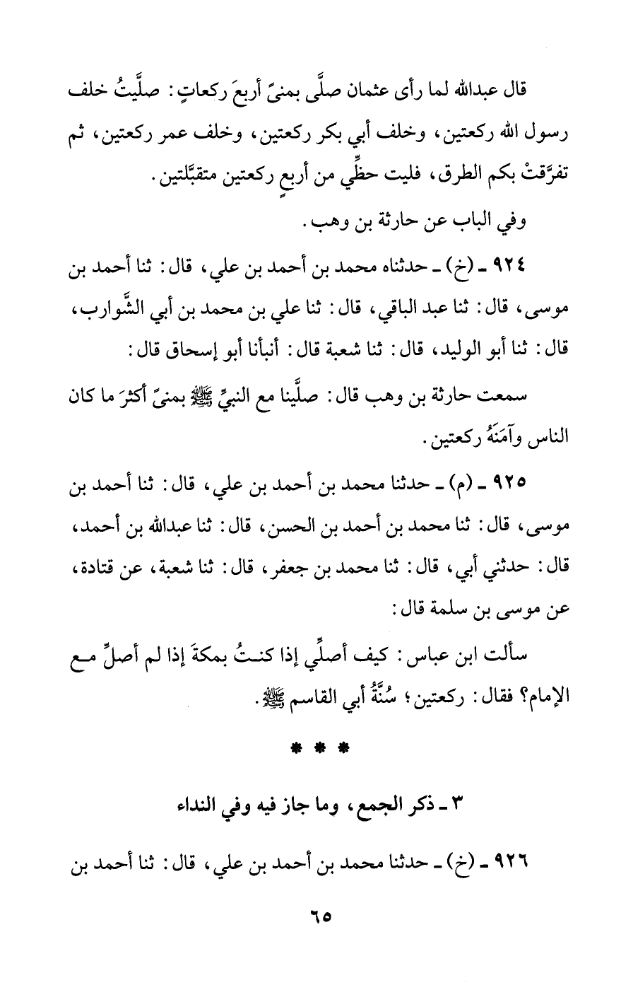 925 - (م) - حدثنا محمد بن أحمد بن علي، قال: ثنا أحمد بن موسى، قال: ثنا محمد بن أحمد بن الحسن، قال: ثنا عبد الله بن أحمد، قال: حدثني أبي، قال: ثنا محمد بن جعفر، قال: ثنا شعبة، عن قتادة، عن موسى بن سلمة قال: