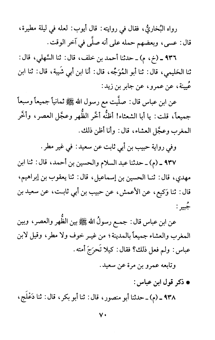 عن ابن عباس قال: جمع رسول الله صلى الله عليه وسلم بين الظهر والعصر، وبين المغرب والعشاء جميعا بالمدينة؛ من غير خوف ولا مطر، وقيل لابن عباس: ولم فعل ذلك؟ فقال: كيلا تحرج أمته.