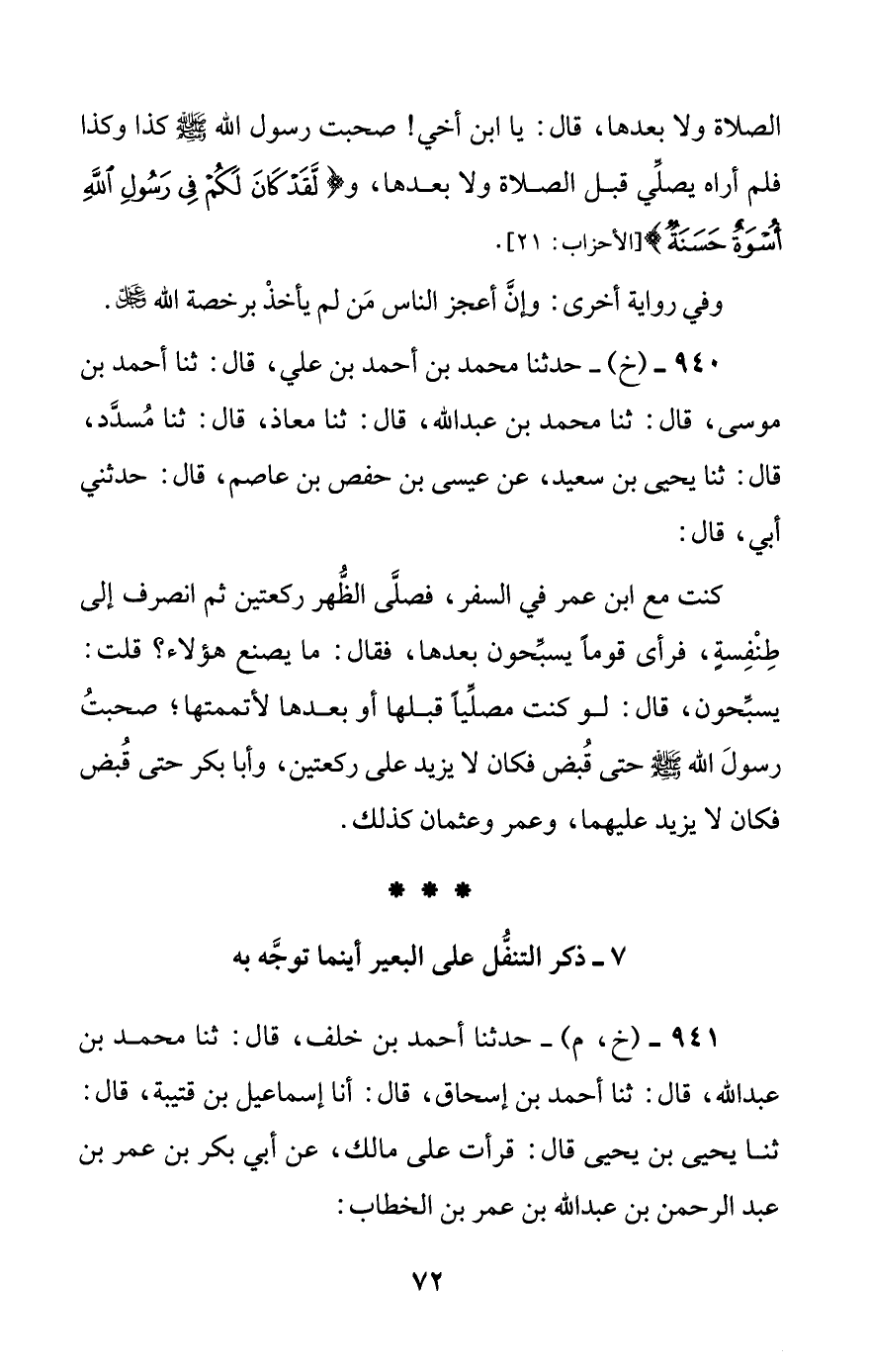 941 - (خ، م) - حدثنا أحمد بن خلف، قال: ثنا محمد بن عبد الله، قال: ثنا أحمد بن إسحاق، قال: أنا إسماعيل بن قتيبة، قال: ثنا يحيى بن يحيى قال: قرأت على مالك، عن أبي بكر بن عمر بن عبد الرحمن بن عبد الله بن عمر بن الخطاب: #73# عن سعيد بن يسار قال: كنت أسير مع عبد الله بن عمر بطريق مكة، قال سعيد: فلما خشيت الصبح نزلت فأوترت ثم أدركته، فقال عبد الله: أين كنت؟ فقلت: خشيت الصبح فنزلت فأوترت، فقال: أليس لك في رسول الله أسوة حسنة؟ فقلت: بلى والله، قال: فإن رسول الله صلى الله عليه وسلم كان يوتر على البعير.