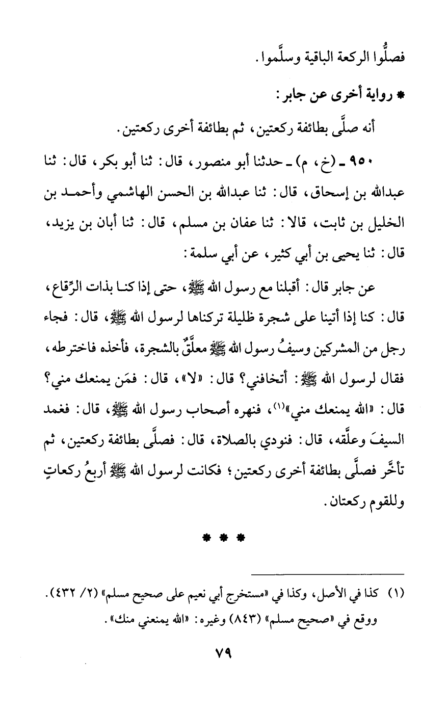 عن جابر قال: أقبلنا مع رسول الله صلى الله عليه وسلم، حتى إذا كنا بذات الرقاع، قال: كنا إذا أتينا على شجرة ظليلة تركناها لرسول الله صلى الله عليه وسلم، قال: فجاء رجل من المشركين وسيف رسول الله صلى الله عليه وسلم معلق بالشجرة، فأخذه فاخترطه، فقال لرسول الله صلى الله عليه وسلم: أتخافني؟ قال: ((لا))، قال: فمن يمنعك مني؟ قال: ((الله يمنعك مني))، فنهره أصحاب رسول الله صلى الله عليه وسلم، قال: فغمد السيف وعلقه، قال: فنودي بالصلاة، قال: فصلى بطائفة ركعتين، ثم تأخر فصلى بطائفة أخرى ركعتين؛ فكانت لرسول الله صلى الله عليه وسلم أربع ركعات وللقوم ركعتان.