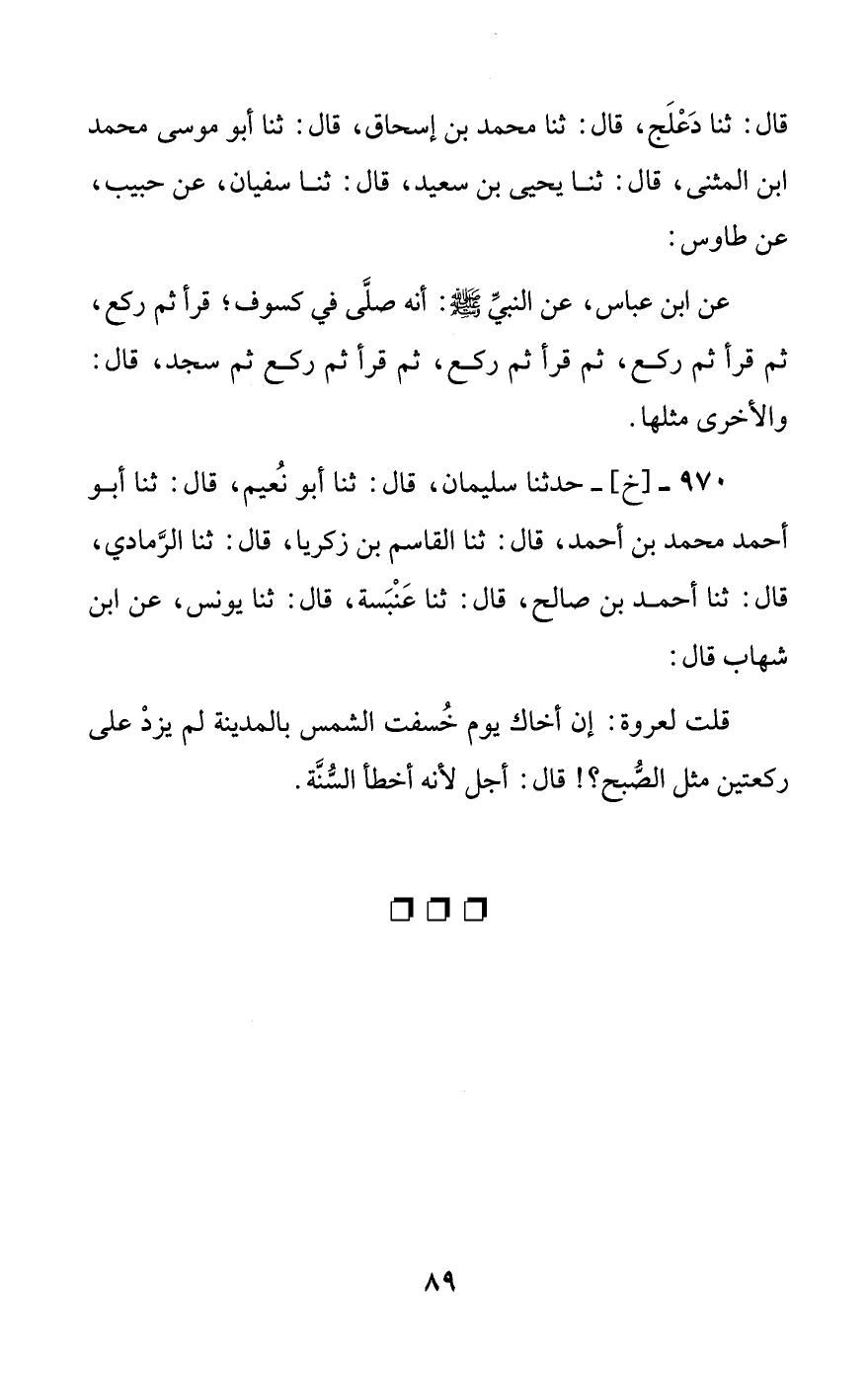 قلت لعروة: إن أخاك يوم خسفت الشمس بالمدينة لم يزد على ركعتين مثل الصبح؟! قال: أجل لأنه أخطأ السنة.