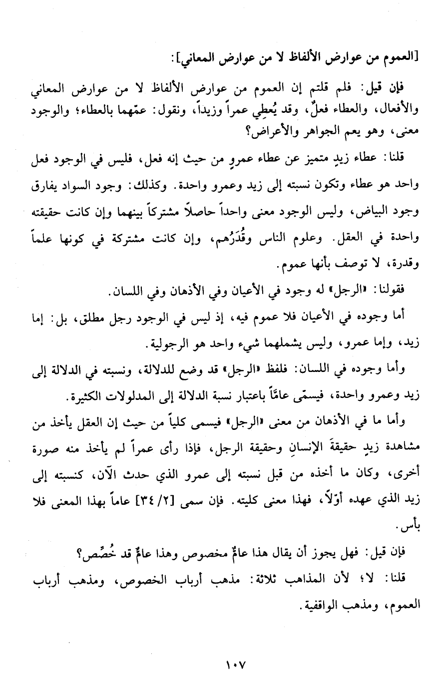 فقولنا :الرجل له وجود في الأعيان وفي الأذهان وفي اللسان أما وجوده في الأعيان فلا عموم فيه إذ ليس في الوجود رجل مطلق بل إما زيد وإما عمرو وليس يشملهما شيء واحد هو الرجولية وأما وجوده في اللسان فلفظ الرجل قد وضع للدلالة ونسبته في الدلالة إلى زيد وعمرو واحدة يسمى عاما باعتبار نسبة الدلالة إلى المدلولات الكثيرة وأما ما في الأذهان من معنى الرجل فيسمى كليا من حيث أن العقل يأخذ من مشاهدة زيد حقيقة الإنسان وحقيقة الرجل فإذا رأى عمرا لم يأخذ منه صورة أخرى وكان ما أخذه من قبل نسبته إلى عمرو والذي حدث الآن كنسبته إلى زيد الذي عهده أولا فهذا معنى كليته فإن سمي عاما بهذا فلا بأس