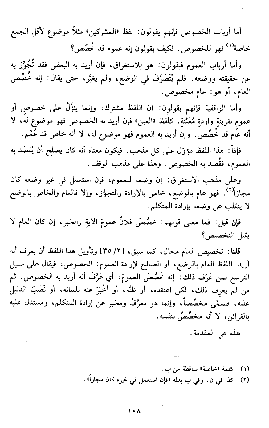 وأما الواقفية: فإنهم يقولون إن اللفظ مشترك وإنما ينزل على خصوص أو عموم بقرينة وإرادة معينة كلفظ العين فإن أريد به الخصوص فهو موضوع له لا أنه عام قد خصص وإن أريد به العموم فهو موضوع له لا أنه خاص قد عمم