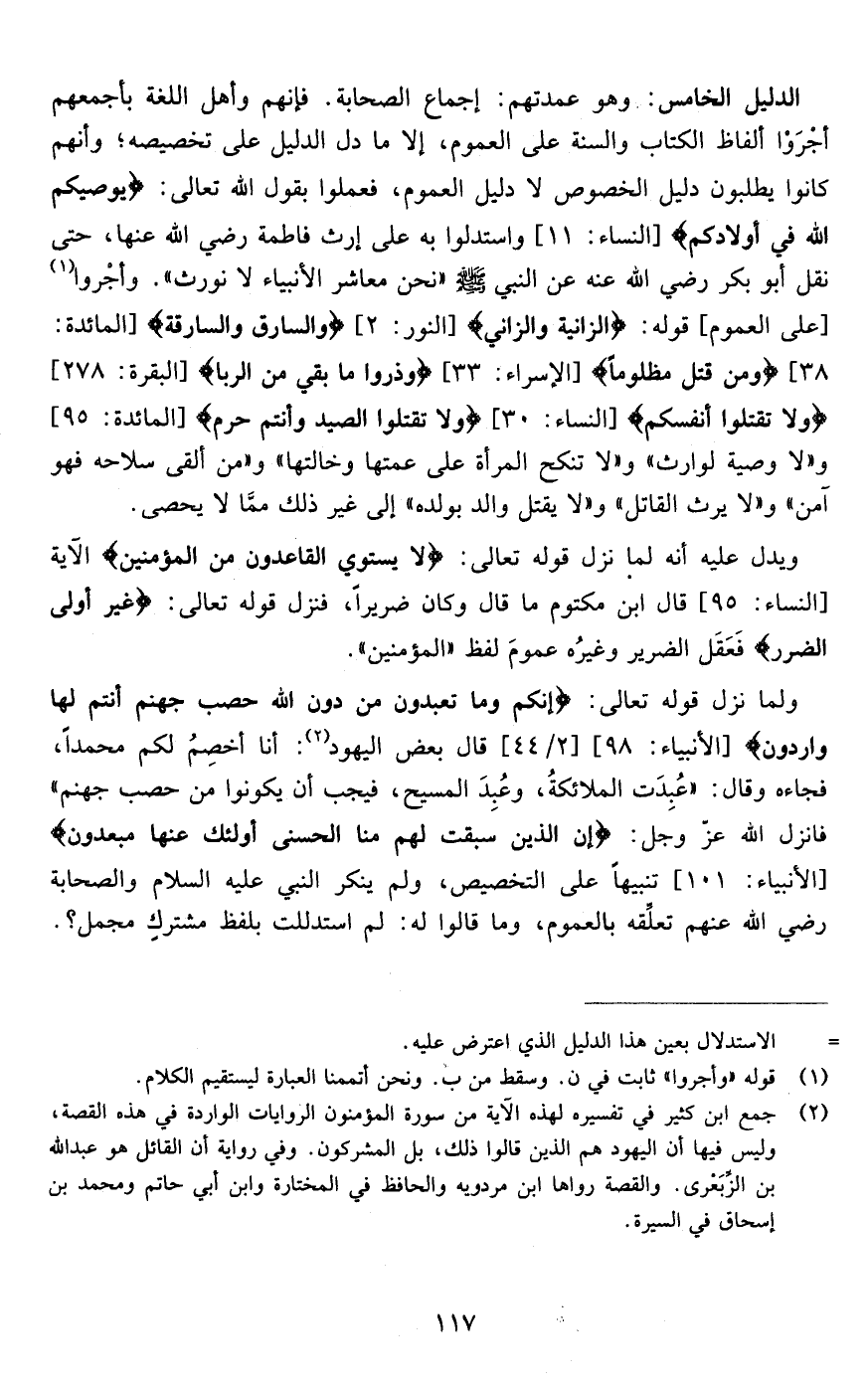 الدليل الخامس : وهو عمدتهم إجماع الصحابة فإنهم وأهل اللغة بأجمعهم أجروا ألفاظ الكتاب والسنة على العموم إلا ما دل الدليل على تخصيصه وإنهم كانوا يطلبون دليل الخصوص لا دليل العموم فعملوا بقول الله تعالى {يُوصِيكُمُ اللَّهُ فِي أَوْلادِكُمْ} ]النساء: من الآية11[ واستدلوا به على إرث فاطمة رضي الله عنها حتى نقل أبو بكر رضي الله عنه عن النبي: "نحن معاشر الأنبياء لا نورث" وقوله {الزَّانِيَةُ وَالزَّانِي } ]النور: من الآية2[ {وَالسَّارِقُ وَالسَّارِقَةُ )]المائدة: من الآية38 [{وَمَنْ قُتِلَ مَظْلُوماً ) ]الاسراء: من الآية33[ {وَذَرُوا مَا بَقِيَ مِنَ الرِّبا} ]البقرة: من الآية278[ {وَلا تَقْتُلُوا أَنْفُسَكُمْ} ]النساء: من الآية29 [{لا تَقْتُلُوا الصَّيْدَ وَأَنْتُمْ حُرُمٌ } ]المائدة: من الآية95[ المائدة ولا وصية لوارث ولا تنكح المرأة على عمتها وخالتها ومن ألقى سلاحه فهو آمن ولا يرث القاتل ولا يقتل والد بولده إلى غير ذلك مما لا يحصى