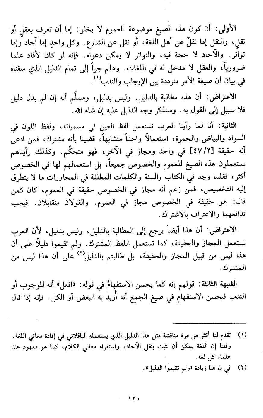 الثانية: إنا لما رأينا العرب تستعمل لفظ العين في مسمياته ولفظ اللون في السواد والبياض والحمرة استعمالا واحدا متشابها قضينا بأنه مشترك فمن ادعى أنه حقيقة في واحد ومجاز في الآخر فهو متحكم وكذلك رأيناهم يستعملون هذه الصيغ للعموم والخصوص جميعا بل استعمالهم لها في الخصوص أكثر فقلما وجد في الكتاب والسنة والكلمات المطلقة في المحاورات ما لا يتطرق إليه التخصيص فمن زعم أنه مجاز في الخصوص حقيقة في العموم كان كمن قال هو حقيقة في الخصوص مجاز في العموم والقولان متقابلان فيجب تدافعهما والاعتراف بالاشتراك