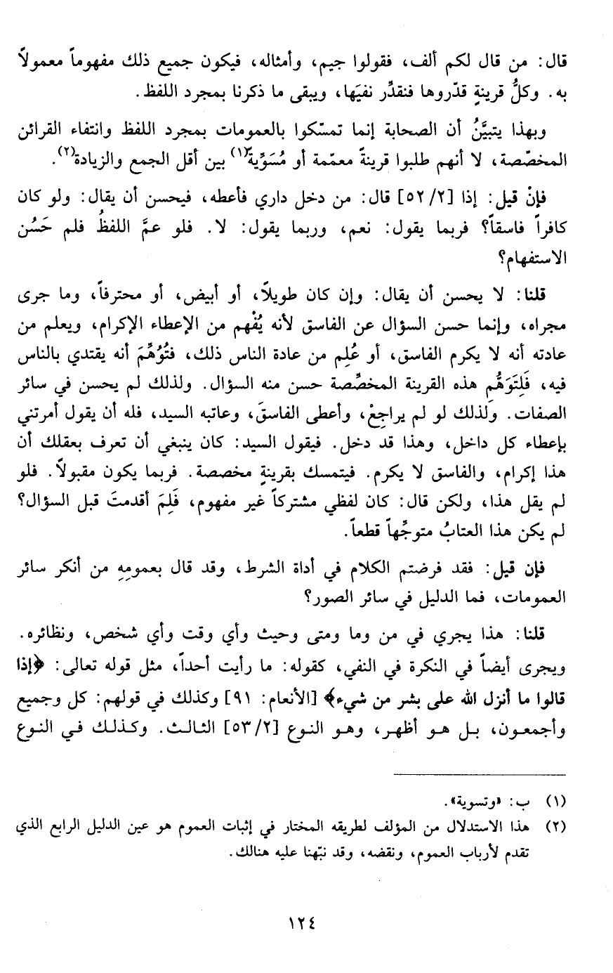 قلنا :هذا يجري في من و ما و متى و حيث وأي وقت وأي شخص ونظائره ويجري أيضا في النكرة في النفي كقوله ما رأيت أحدا مثل قوله تعالى {مَا أَنْزَلَ اللَّهُ عَلَى بَشَرٍ مِنْ شَيْءٍ } ]الأنعام: من الآية91[وكذلك في قولهم كل و جميع و أجمعون بل هو أظهر وهو النوع الثالث وكذلك في النوع