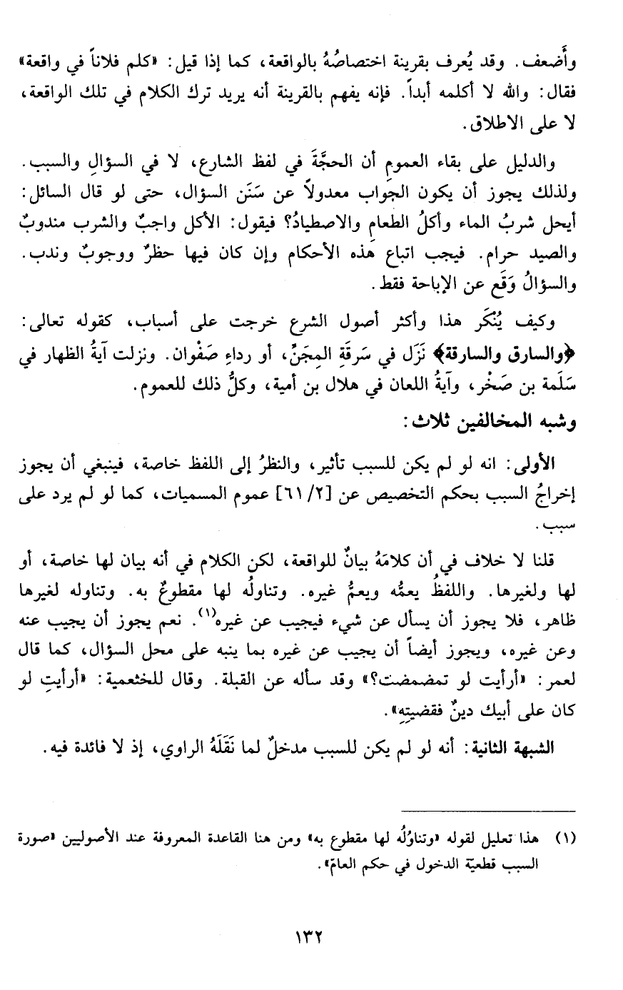 والدليل على بقاء العموم أن الحجة في لفظ الشارع لا في السؤال والسبب ولذلك يجوز أن يكون الجواب معد ولا عن سنن السؤال حتى لو قال السائل أيحل شرب الماء وأكل الطعام والاصطياد فيقول الأكل واجب والشرب مندوب والصيد حرام فيجب اتباع هذه الأحكام وإن كان فيه خطر ووجوب والسؤال وقع عن الإباحة فقط