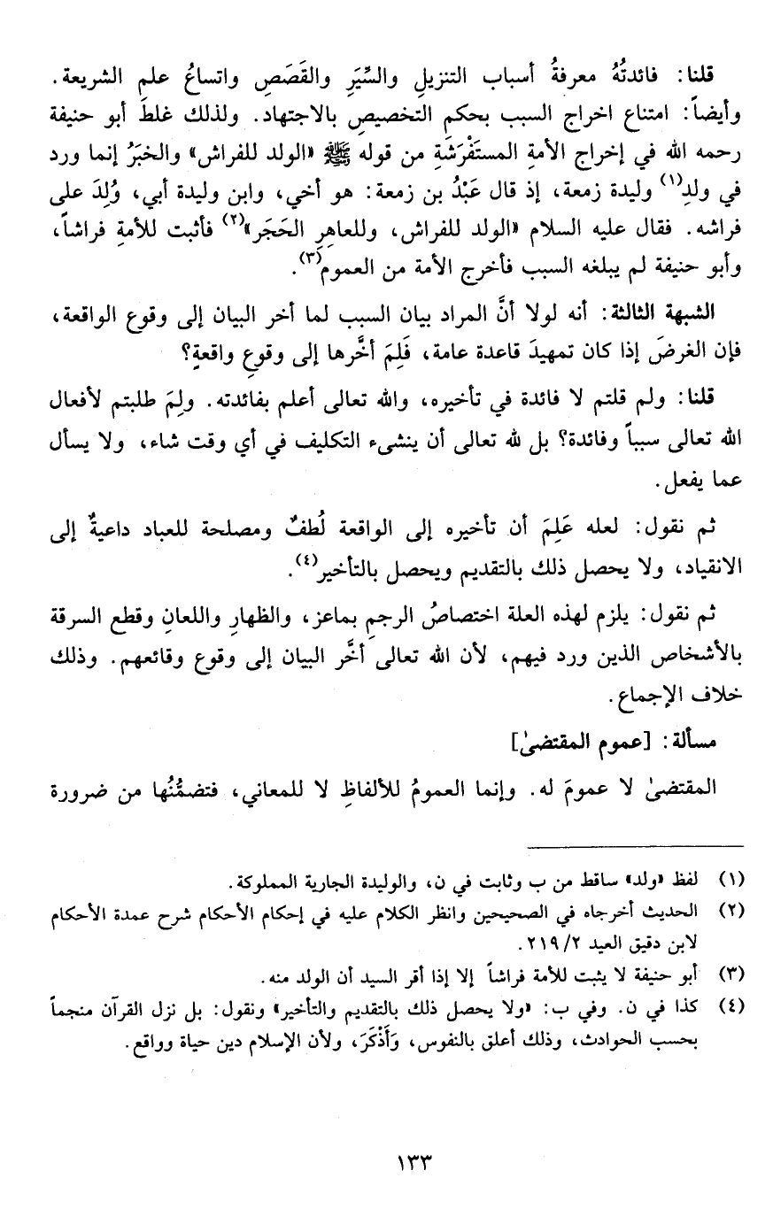 قلنا:فائدته معرفة أسباب التنزيل والسير والقصص واتساع علم الشريعة وأيضا امتناع إخراج السبب بحكم التخصيص بالاجتهاد ولذلك غلط أبو حنيفة رحمه الله في إخراج الأمة المستفرشة من قوله صلى الله عليه وسلم "الولد للفراش" والخبر إنما ورد في وليدة زمعة إذ قال عبد بن زمعة هو أخي وابن وليدة أبي ولد على فراشه فقال عليه السلام الولد للفراش وللعاهر الحجر فأثبت للأمة فراشا وأبو حنيفة لم يبلغه السبب فأخرج الأمة من العموم