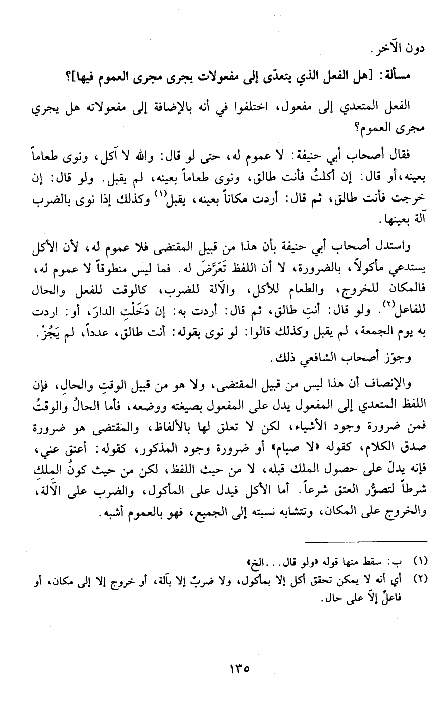 الفعل المتعدي إلى مفعول اختلفوا في أنه بالإضافة إلى مفعولاته هل يجري مجرى العموم