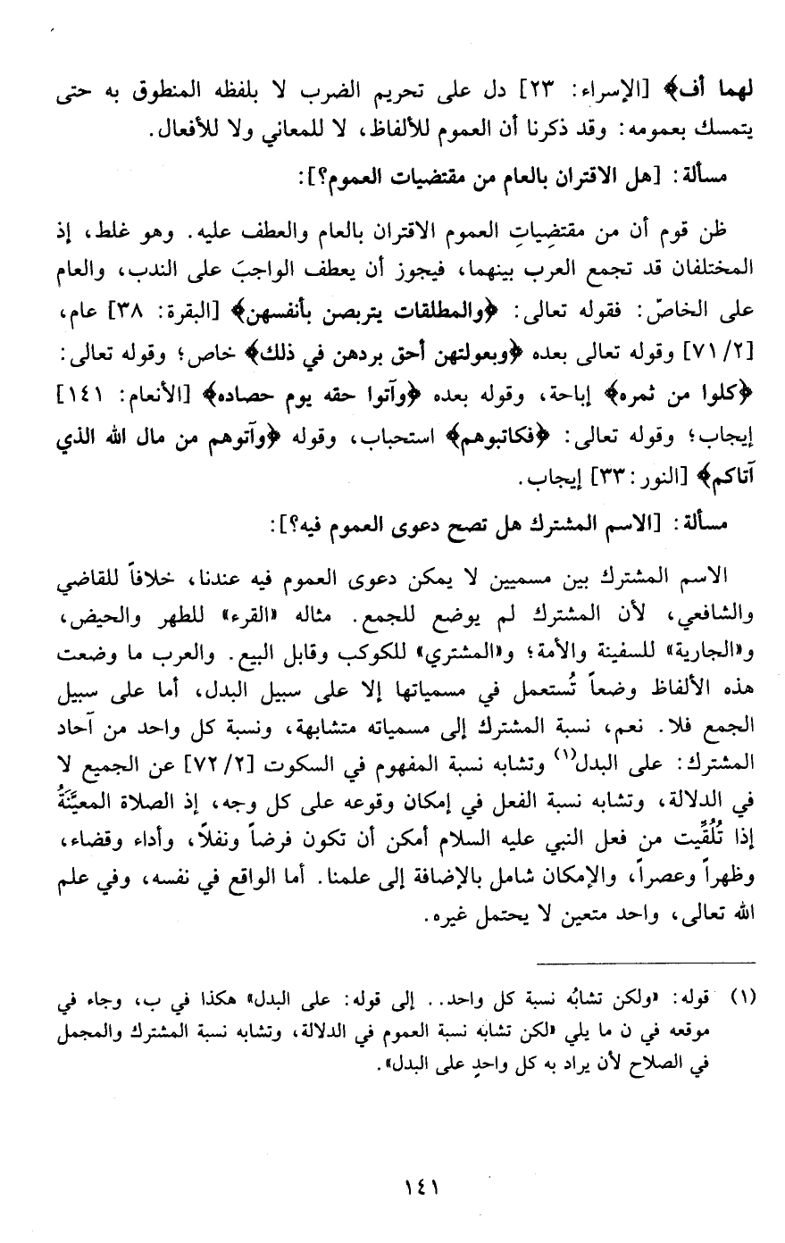 ظن قوم أن من مقتضيات العموم الاقتران بالعام والعطف عليه وهو غلط إذ المختلفات قد تجمع العرب بينهما فيجوز أن يعطف الواجب على الندب والعام على الخاص فقوله تعالى {وَالْمُطَلَّقَاتُ يَتَرَبَّصْنَ بِأَنْفُسِهِنَّ} [البقرة: من الآية228]عام وقوله بعد {وَبُعُولَتُهُنَّ أَحَقُّ بِرَدِّهِنَّ} [البقرة: من الآية228] في ذلك خاص وقوله تعالى {كُلُوا مِنْ ثَمَرِهِ إِذَا أَثْمَرَ} [الأنعام: من الآية141] إباحة وقوله بعده { وَآتُوا حَقَّهُ يَوْمَ حَصَادِهِ } ]الأنعام: من الآية141[إيجاب وقوله تعالى { فَكَاتِبُوهُمْ}[ النور: من الآية33] استحباب وقوله {وَآتُوهُمْ مِنْ مَالِ اللَّهِ الَّذِي آتَاكُمْ } [النور: من الآية33] إيجاب