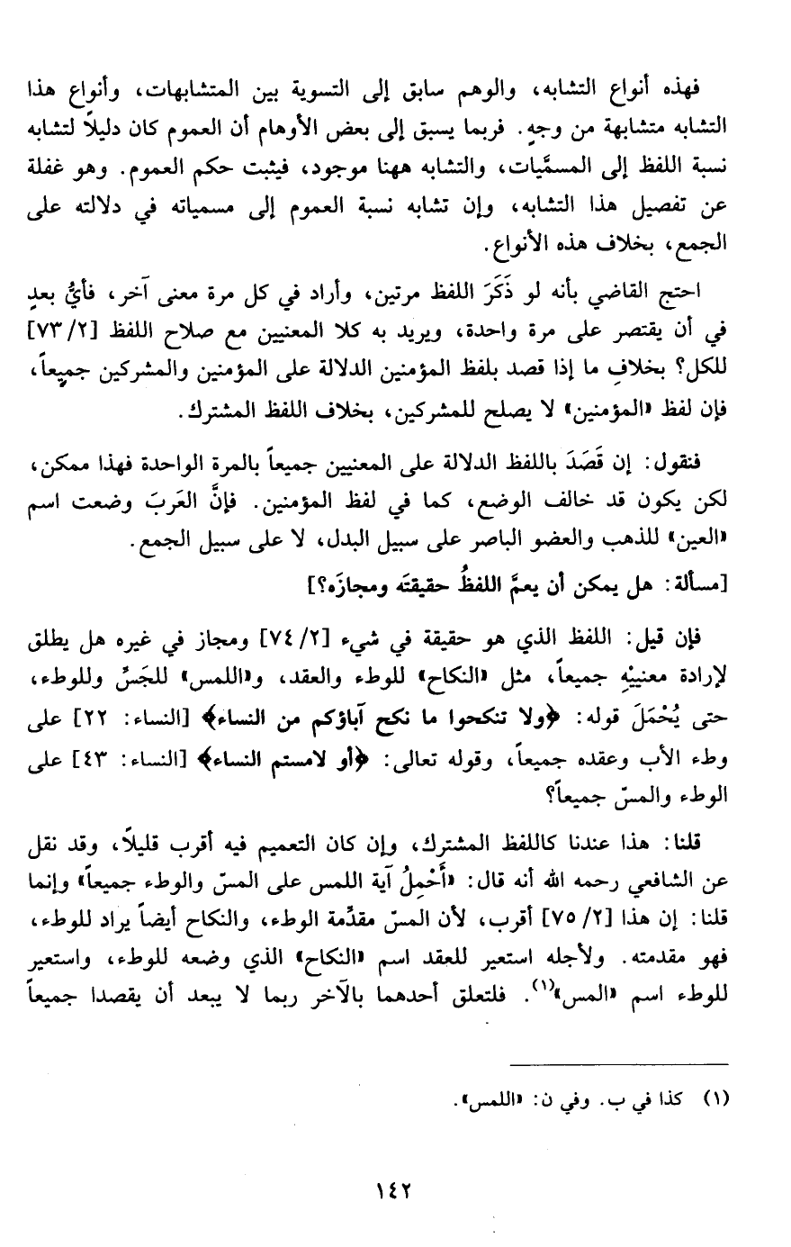 احتج القاضي بأنه لو ذكر اللفظ مرتين وأراد في كل مرة معنى آخر جاز فأي بعد في أن يقتصر على مرة واحدة ويريد به كلا المعنيين مع صلاح اللفظ للكل بخلاف ما إذا قصد بلفظ المؤمنين الدلالة على المؤمنين والمشركين جميعا فإن لفظ المؤمنين لا يصلح للمشركين بخلاف اللفظ المشترك