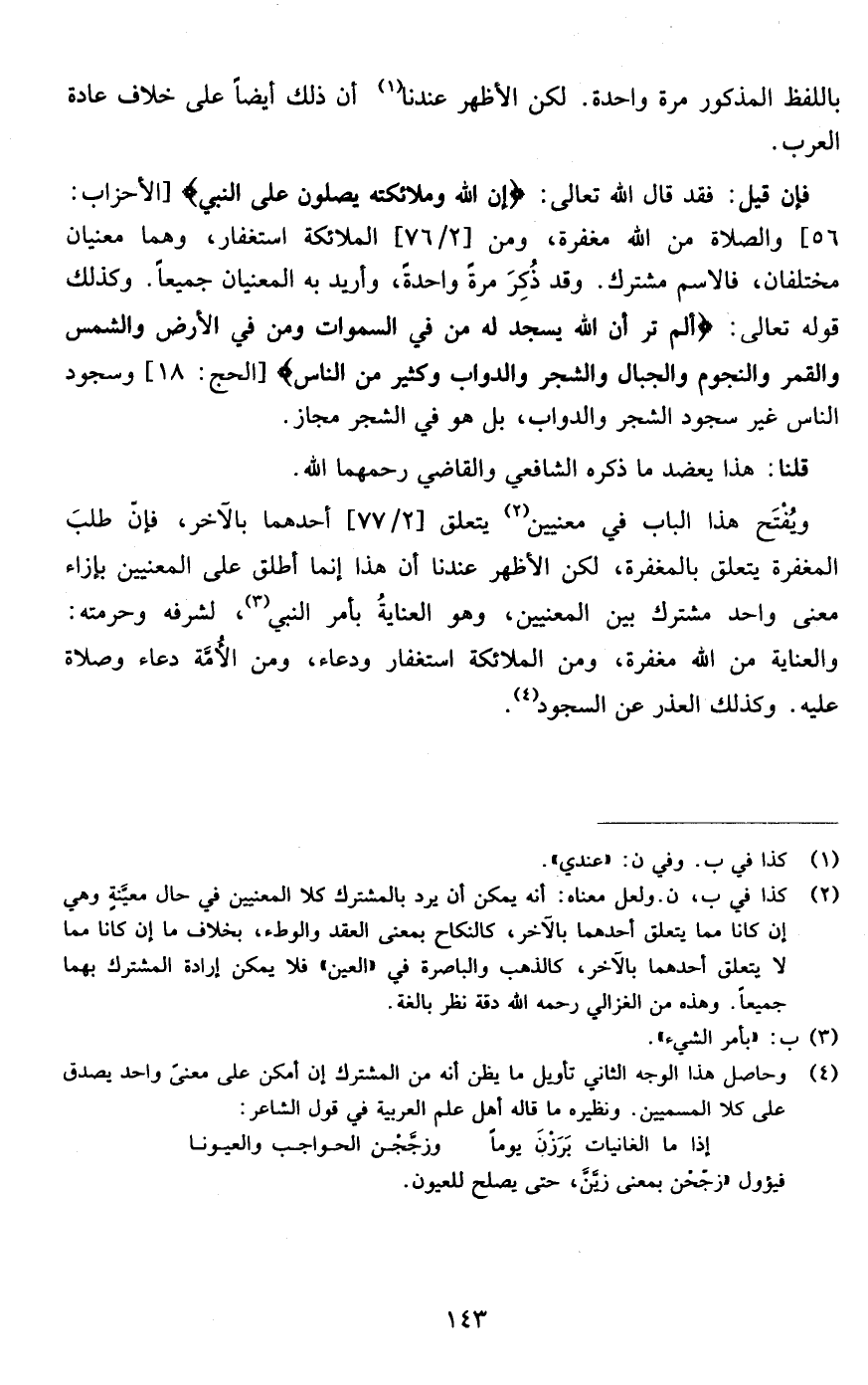 فإن قيل :فقد قال الله تعالى {إِنَّ اللَّهَ وَمَلائِكَتَهُ يُصَلُّونَ عَلَى النَّبِيِّ} ]الأحزاب: من الآية56[والصلاة من الله مغفرة ومن الملائكة استغفار وهما معنيان مختلفان والاسم مشترك وقد ذكر مرة واحدة وأريد به المعنيان جميعا وكذلك قوله تعالى {أَلَمْ تَرَ أَنَّ اللَّهَ يَسْجُدُ لَهُ مَنْ فِي السَّمَاوَاتِ وَمَنْ فِي الأَرْضِ وَالشَّمْسُ وَالْقَمَرُ وَالنُّجُومُ وَالْجِبَالُ وَالشَّجَرُ وَالدَّوُابُّ وَكَثِيرٌ مِنَ النَّاسِ} [الحج: من الآية18] وسجود الناس غير سجود الشجر والدواب بل هو في الشجر مجاز
