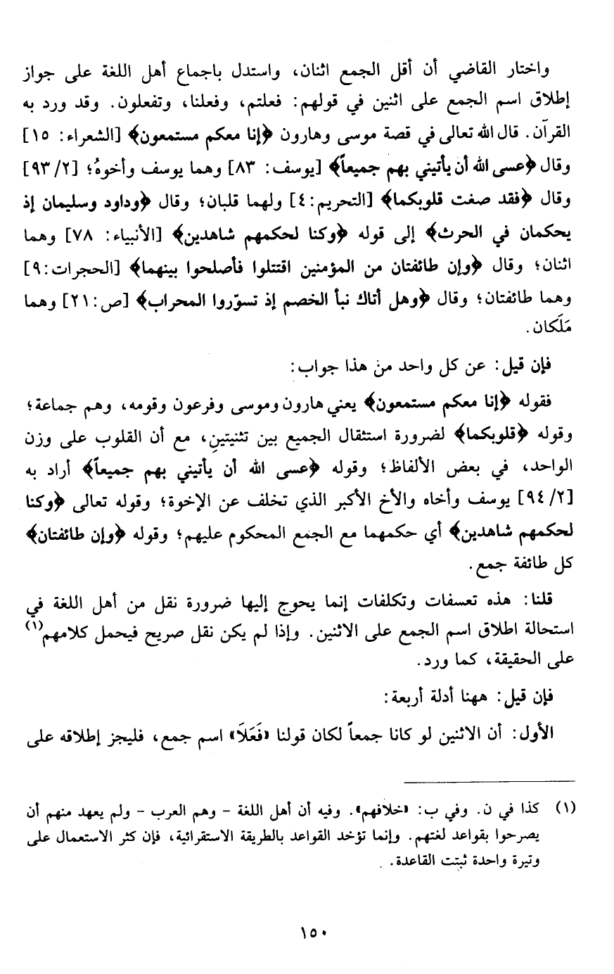 فقوله {إِنَّا مَعَكُمْ مُسْتَمِعُونَ} ]الشعراء: من الآية15[الشعراء يعني هارون وموسى وفرعون وقومه وهم جماعة وقوله {قُلُوبُكُمَا } ]التحريم: من الآية4[لضرورة استثقال الجمع بين اثنتين مع أن القلوب على وزن الواحد في بعض الألفاظ وقوله {عَسَى اللَّهُ أَنْ يَأْتِيَنِي بِهِمْ جَمِيعاً} ]يوسف: من الآية83[ أراد به يوسف وأخاه والأخ الأكبر الذي تخلف عن الأخوة وقوله تعالى {وَكُنَّا لِحُكْمِهِمْ شَاهِدِينَ} ]الانبياء: من الآية78[أي حكمهما مع الجمع المحكوم عليهم وقوله {وَإِنْ طَائِفَتَانِ } ]الحجرات: من الآية9[كل طائفة جمع