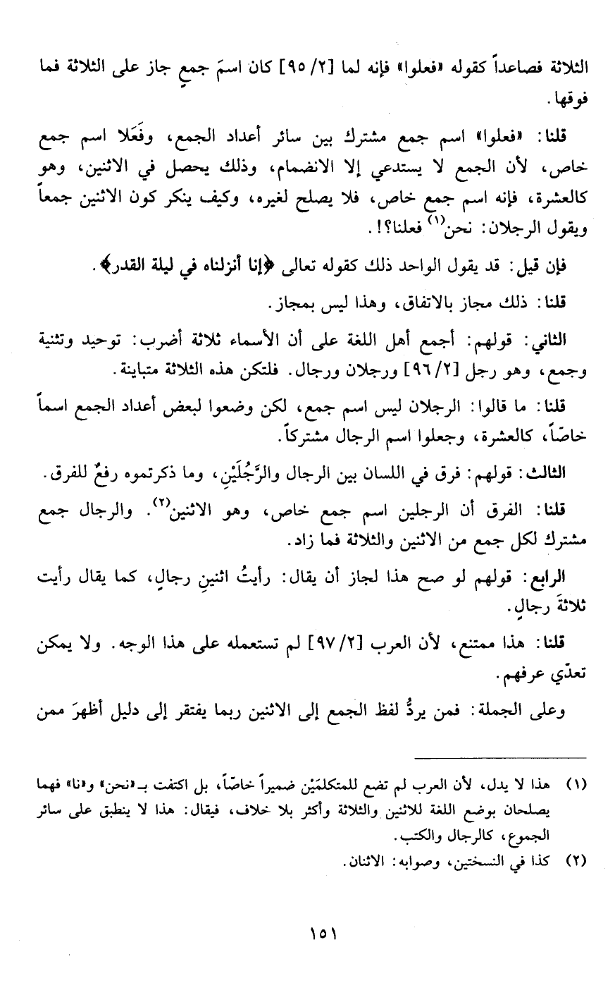 قلنا:فعلوا اسم جمع مشترك بين سائر أعداد الجمع وفعلا اسم جمع خاص لأن الجمع لا يستدعي إلا الانضمام وذلك يحصل في الاثنين وهو كالعشرة فإنه اسم جمع لكن جمع خاص فلا يصلح لغيره وكيف ينكر كون الاثنين جمعا ويقول الرجلان نحن فعلنا