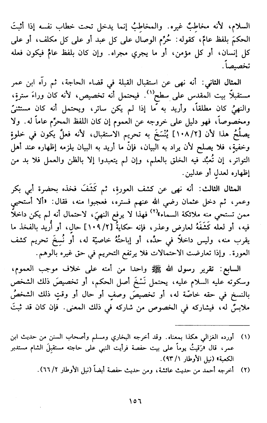 المثال الثاني : أنه نهى عن استقبال القبلة في قضاء الحاجة ثم رآه ابن عمر مستقبلا بيت المقدس على سطح فيحتمل أنه تخصيص لأنه كان وراء سترة والنهي كان مطلقا وأريد به ما إذا لم يكن ساتر ويحتمل أنه كان مستثنى ومخصوصا فهو دليل على خروجه عن العموم إن كان اللفظ المحرم عاما له ولا يصلح هذا لأن ينسخ به تحريم الاستقبال لأنه فعل يكون في خلوة وخفية فلا يصلح لأن يراد به البيان فإن ما أريد به البيان يلزمه إظهاره عند أهل التواتر أن تعبد فيه الخلق بالعلم وإن لم يتعبدوا إلا بالظن والعمل فلا بد من إظهاره لعدل أو لعدلين