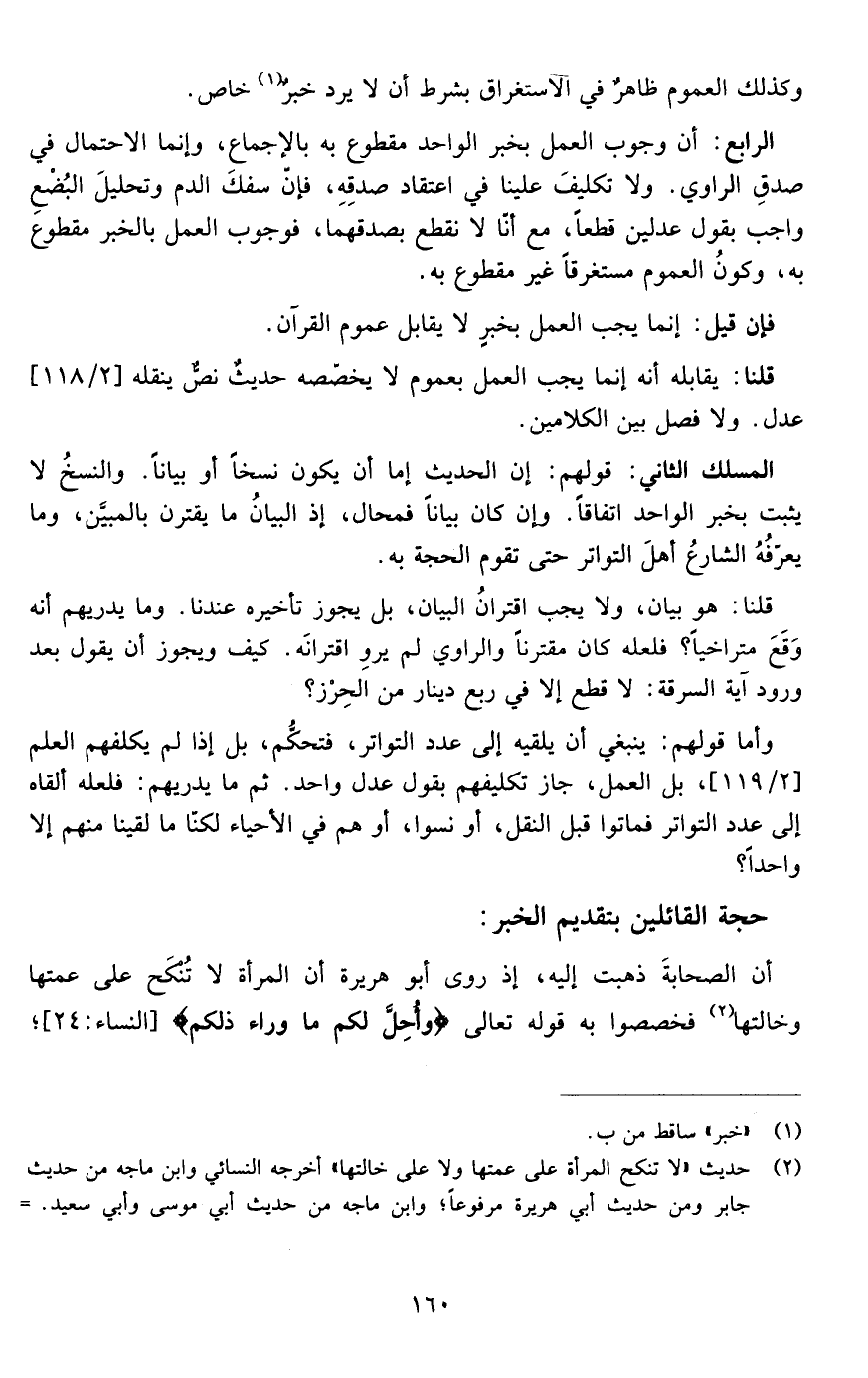 أن الصحابة ذهبت إليه إذ روى أبو هريرة أن المرأة لا تنكح على عمتها وخالتها فخصصوا به قوله تعالى {وَأُحِلَّ لَكُمْ مَا وَرَاءَ ذَلِكُمْ} ]النساء: من الآية24[