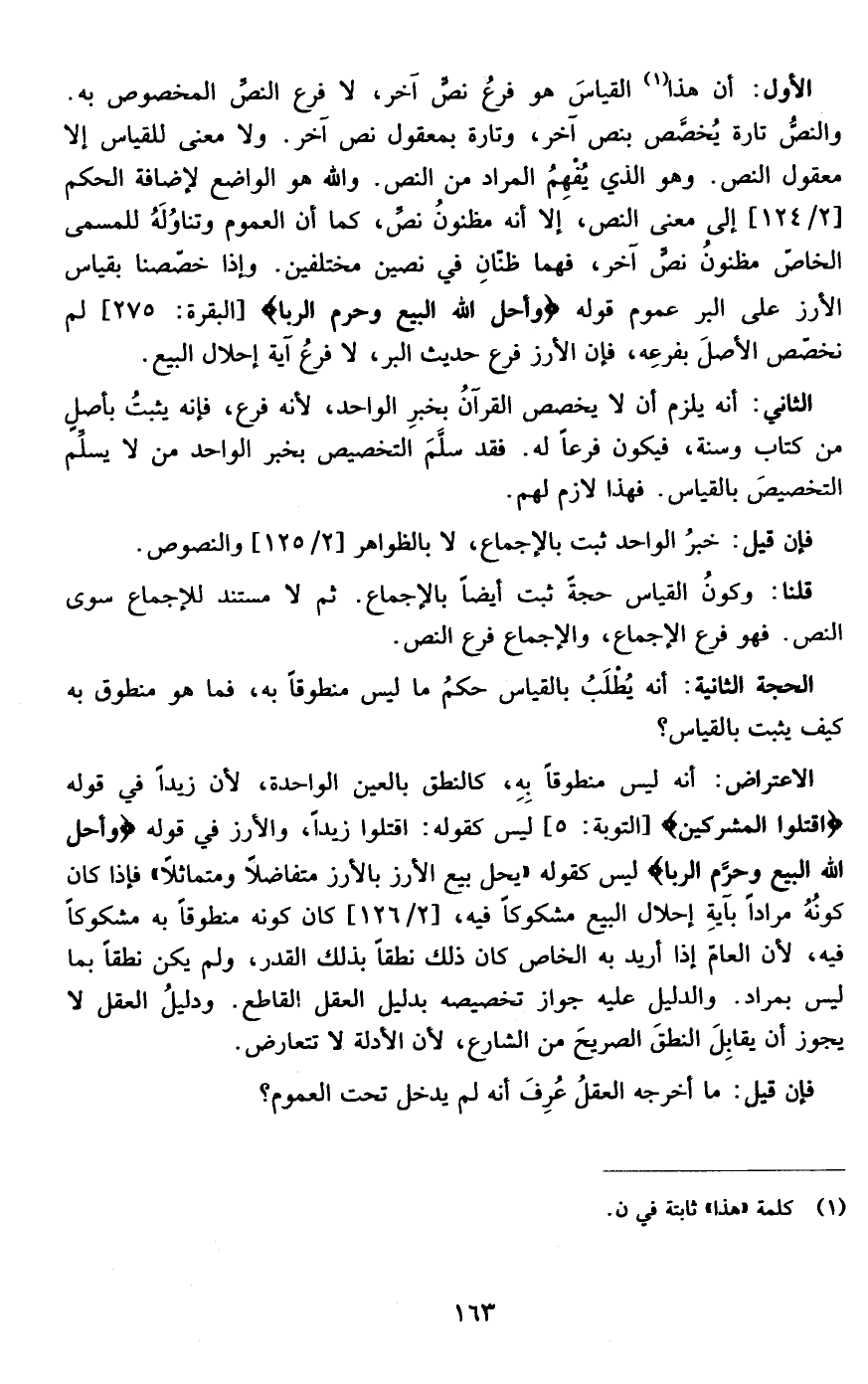 الاعتراض:أنه ليس منطوقا به كالنطق بالعين الواحدة لأن زيدا في قوله {فَاقْتُلُوا الْمُشْرِكِينَ } ]التوبة: من الآية5[ليس كقوله اقتلوا زيدا والأرز في قوله {وَأَحَلَّ اللَّهُ الْبَيْعَ وَحَرَّمَ الرِّبا } ]البقرة: من الآية275[ليس كقوله يحل بيع الأرز بالأرز متفاضلا ومتماثلا فإذا كان كونه مرادا بآية إحلال البيع مشكوكا فيه كان كونه منطوقا به مشكوكا فيه لأن العام إذا أريد به الخاص كان ذلك نطقا بذلك القدر ولم يكن نطقا بما ليس بمراد والدليل عليه جواز تخصيصه بدليل العقل القاطع ودليل العقل لا يجوز أن يقابل النطق الصريح من الشارع لأن الأدلة لا تتعارض