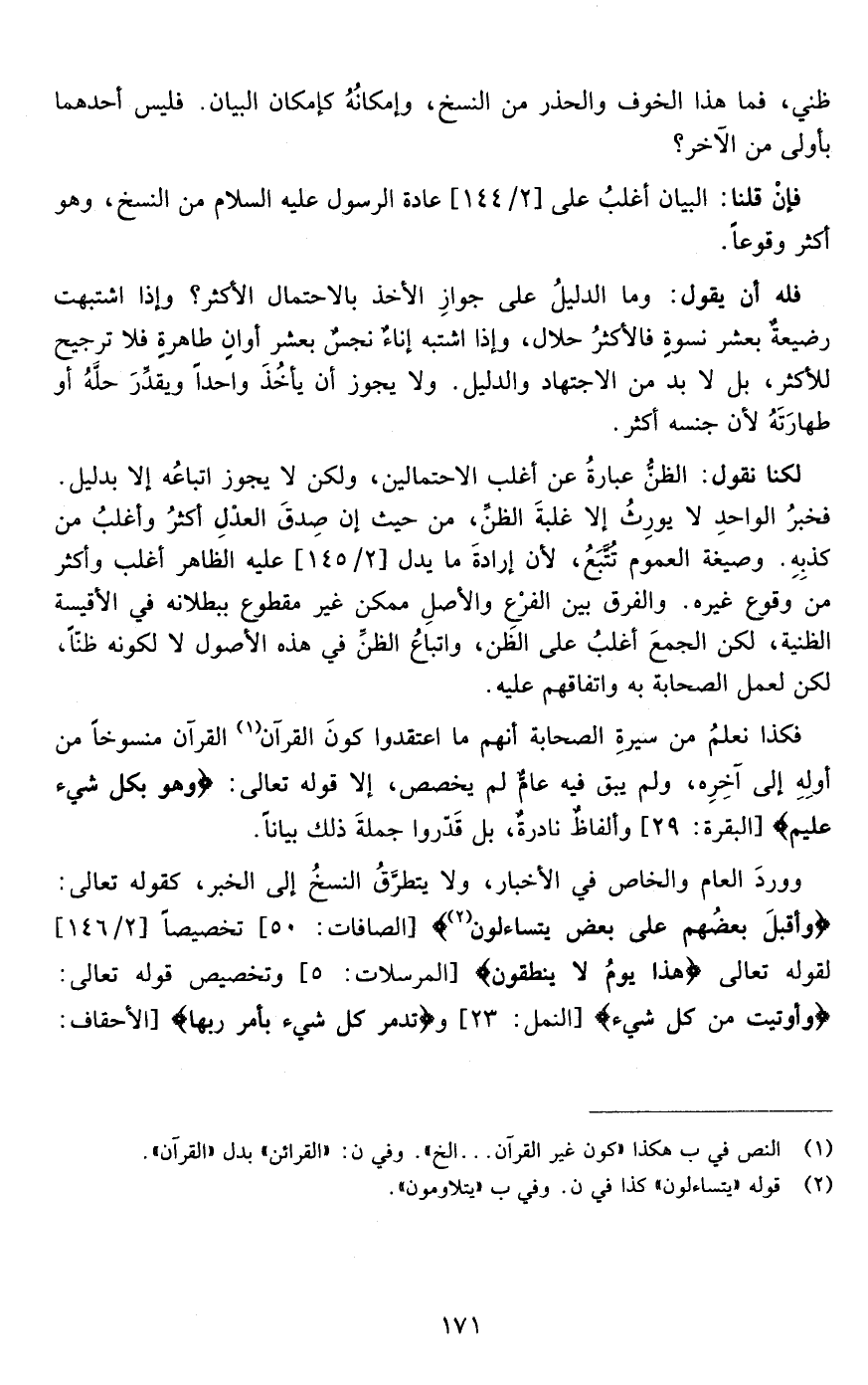 فكذا نعلم من سيرة الصحابة إنهم ما اعتقدوا كون غير القرآن منسوخا من أوله إلى آخره ولم يبق فيه عام لم يخصص إلا قوله تعالى {وَهُوَ بِكُلِّ شَيْءٍ عَلِيمٌ} ]البقرة: من الآية29[وألفاظ نادرة بل قدروا جملة ذلك بيانا وورد العام والخاص في الأخبار ولا يتطرق النسخ إلى الخبر كقوله تعالى {فَأَقْبَلَ بَعْضُهُمْ عَلَى بَعْضٍ يَتَلاوَمُونَ} ]القلم:30 [ القلم وتخصيصا لقوله تعالى هذا يوم لا ينطقون المرسلات وتخصيص قوله تعالى {وَأُوتِيَتْ مِنْ كُلِّ شَيْءٍ} ]النمل: من الآية23[و {تُدَمِّرُ كُلَّ شَيْءٍ بِأَمْرِ رَبِّهَا} ]الاحقاف: