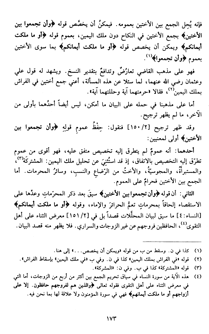 الثاني : أن قوله {وَأَنْ تَجْمَعُوا بَيْنَ الأُخْتَيْنِ } ]النساء: من الآية23[ سيق بعد ذكر المحرمات وعدها على الاستقصاء إلحاق لمحرمات تعم الحرائر والإماء وقوله {أَوْ مَا مَلَكَتْ أَيْمَانُكُمْ} ]النساء: من الآية3[ ما سيق لبيان المحللات قصدا بل في معرض الثناء على أهل التقوى الحافظين فروجهم عن غير الزوجات والسراري فلا يظهر منه قصد البيان