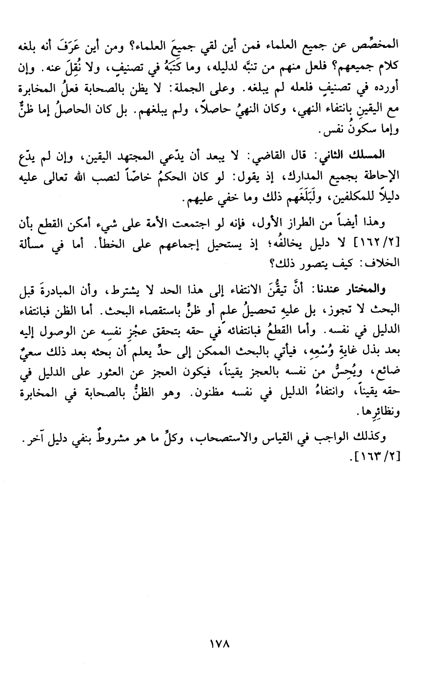 المسلك الثاني :قال القاضي لا يبعد أن يدعي المجتهد اليقين وإن لم يدع الإحاطة بجميع المدارك إذ يقول لو كان الحكم خاصا لنصب الله تعالى عليه دليلا للمكلفين ولبلغهم ذلك وما خفي عليهم وهذا أيضا من الطراز الأول فإنه لو اجتمعت الأمة على شيء أمكن القطع بأن لا دليل يخالفه إذ يستحيل إجماعهم على الخطأ أما في مسألة الخلاف كيف يتصور ذلك ؟