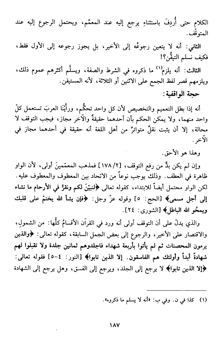 والذي يدل على أن التوقف أولى أنه ورد في القرآن الأقسام كلها من الشمول والاقتصار على الأخير والرجوع إلى بعض الجمل السابقة كقوله تعالى {وَالَّذِينَ يَرْمُونَ الْمُحْصَنَاتِ ثُمَّ لَمْ يَأْتُوا بِأَرْبَعَةِ شُهَدَاءَ فَاجْلِدُوهُمْ ثَمَانِينَ جَلْدَةً وَلا تَقْبَلُوا لَهُمْ شَهَادَةً أَبَداً وَأُولَئِكَ هُمُ الْفَاسِقُونَ إِلاَّ الَّذِينَ تَابُوا } [النور: 5-4]فقوله تعالى {إِلاَّ الَّذِينَ تَابُوا } [النور: من الآية5 ]لا يرجع إلى الجلد ويرجع إلى الفسق وهل يرجع إلى الشهادة