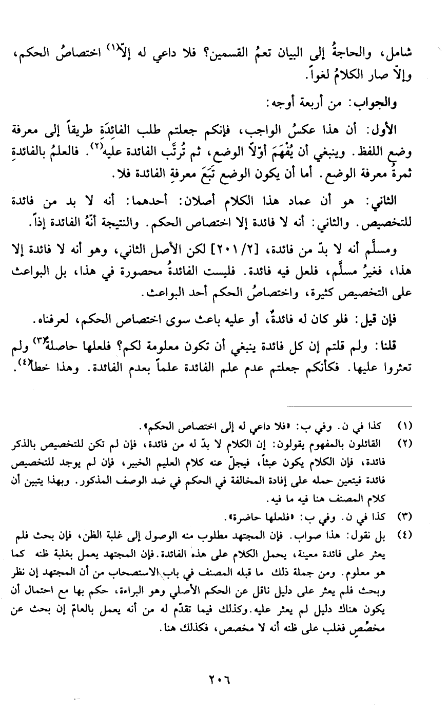 الثاني: وأن عماد هذا الكلام أصلان أحدهما أنه لا بد من فائدة التخصيص والثاني أنه لا فائدة إلا اختصاص الحكم والنتيجة أنه الفائدة إذا