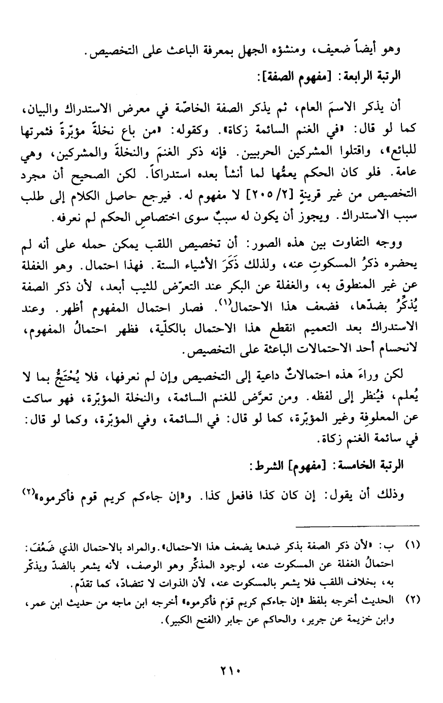 الرابعة: أن يذكر الاسم العام ثم تذكر الصفة الخاصة في معرض الاستدراك والبيان كما لو قال في الغنم السائمة زكاة وكقوله من باع نخلة مؤبرة فثمرها للبائع واقتلوا المشركين الحربيين فإنه ذكر الغنم والنخلة والمشركين وهي عامة فلو كان الحكم يعمها لما أنشأ بعده استدراكا لكن الصحيح أن مجرد هذا التخصيص من غير قرينة لا مفهوم له فيرجع حاصل الكلام إلى طلب سبب الاستدراك ويجوز أن يكون له سبب سوى اختصاص الحكم لم نعرفه