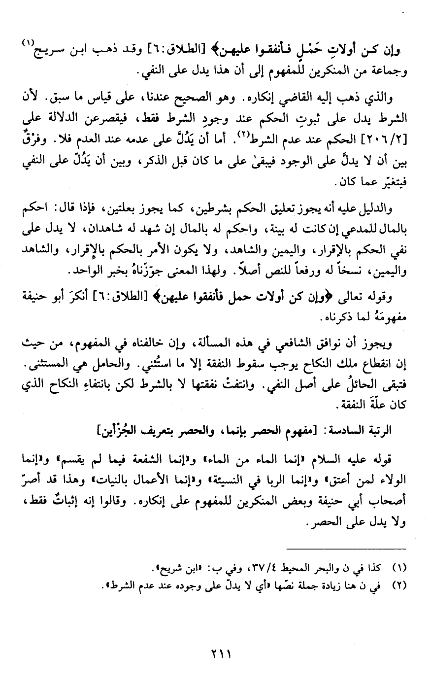 {وَإِنْ كُنَّ أُولاتِ حَمْلٍ فَأَنْفِقُوا عَلَيْهِنَّ } [الطلاق: من الآية6]وقد ذهب ابن شريح وجماعة من المنكرين للمفهوم إلى أن هذا يدل على النفي