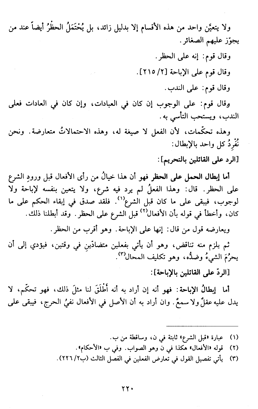 أما إبطال الحمل على الحظر فهو أن هذا خيال من رأى الأفعال قبل ورود الشرع على الحظر قال وهذا الفعل لم يرد فيه شرع ولا يتعين بنفسه لإباحة ولا لوجوب فيبقى على ما كان فلقد صدق في إبقاء الحكم على ما كان وأخطأ في قوله بأن الأحكام قبل الشرع على الحظر وقد أبطلنا ذلك