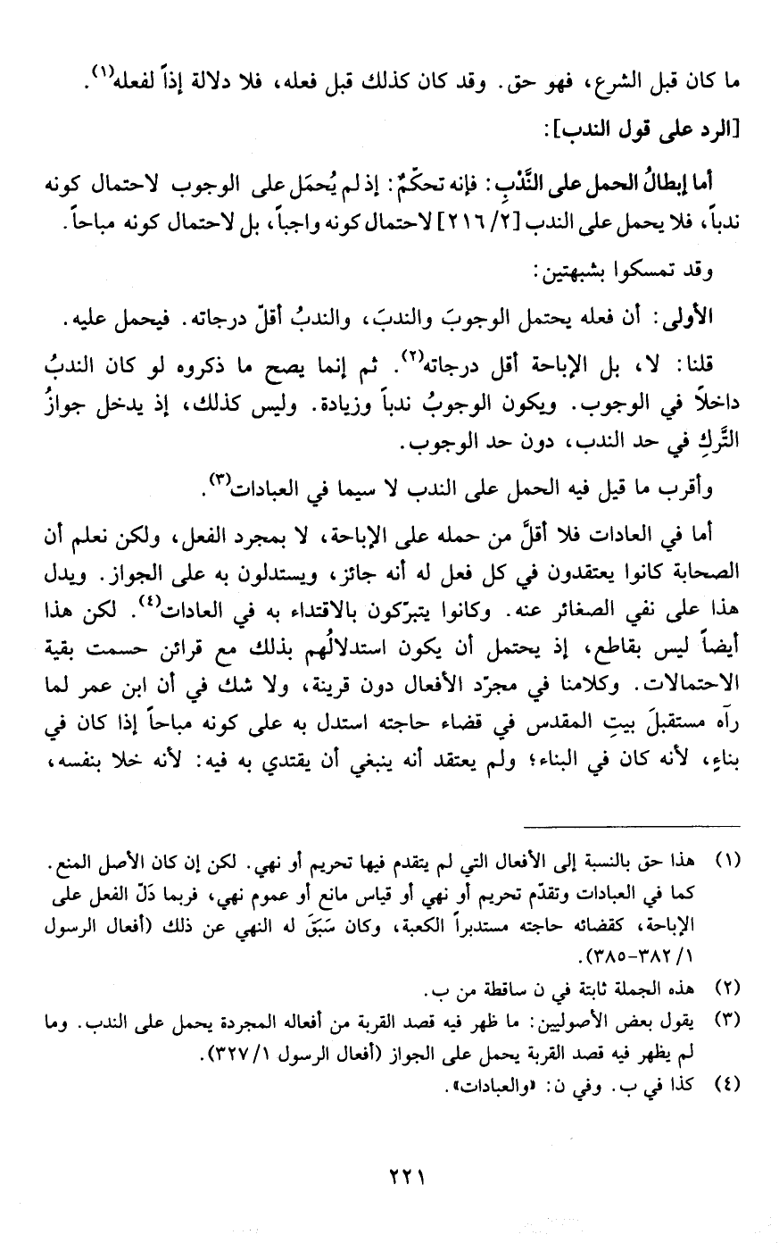 أما في العادات فلا أقل من حمله على الإباحة لا بمجرد الفعل ولكن نعلم أن الصحابة كانوا يعتقدون في كل فعل له أنه جائز ويستدلون به على الجواز ويدل هذا على نفي الصغائر عنه وكانوا يتبركون بالاقتداء به في العادات لكن هذا أيضا ليس بقاطع إذ يحتمل أن يكون استدلالهم بذلك مع قرائن حسمت بقية الاحتمالات وكلامنا في مجرد الأفعال دون قرينة ولا شك في أن ابن عمر لما رآه مستقبل بيت المقدس في قضاء حاجته استدل به على كونه مباحا إذا كان في بناء لأنه كان في البناء ولم يعتقد أنه ينبغي أن يقتدي به فيه لأنه خلا بنفسه
