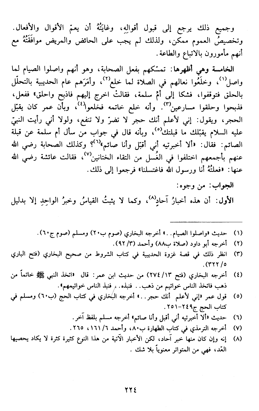 الخامسة وهي أظهرها: تمسكهم بفعل الصحابة وهو أنهم واصلوا الصيام لما واصل وخلعوا نعالهم في الصلاة لما خلع وأمرهم عام الحديبية بالتحلل بالحلق فتوقفوا فشكا إلى أم سلمة فقالت أخرج إليهم واذبح واحلق ففعل فذبحوا وحلقوا مسارعين وإنه خلع خاتمه فخلعوا وبأن عمر كان يقبل الحجر ويقول إني لأعلم أنك حجر لا تضر ولا تنفع ولولا أني رأيت النبي عليه السلام يقبلك ما قبلتك وبأنه قال في جواب من سأل أم سلمة عن قلبة الصائم فقال "ألا أخبرته أني أقبل وأنا صائم" وكذلك الصحابة رضي الله عنهم بأجمعهم اختلفوا في الغسل من التقاء الختانين فقالت عائشة رضي الله عنها "فعلته أنا ورسول الله فاغتسلنا" فرجعوا إلى ذلك