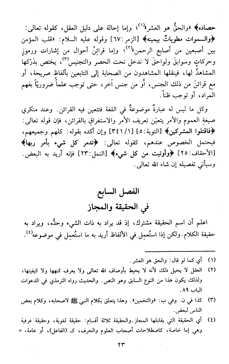 حَصَادِهِ} [الأنعام: من الآية141]والحق هو العشر وإما إحالة على دليل العقل كقوله تعالى {وَمَا قَدَرُوا اللَّهَ حَقَّ قَدْرِهِ وَالأَرْضُ جَمِيعاً قَبْضَتُهُ يَوْمَ الْقِيَامَةِ وَالسَّمَاوَاتُ مَطْوِيَّاتٌ بِيَمِينِهِ سُبْحَانَهُ وَتَعَالَى عَمَّا يُشْرِكُونَ} [الزمر:67]وقوله عليه السلام: "قلب المؤمن بين أصبعين من أصابع الرحمن" وإما قرائن أحوال من إشارات ورموز وحركات وسوابق ولواحق لا تدخل تحت الحصر والتخمين يختص بدركها المشاهد لها فينقلها المشاهدون من الصحابة إلى التابعين بألفاظ صريحة أو مع قرائن من ذلك الجنس أو من جنس آخر حتى توجب علما ضروريا بفهم المراد أو توجب ظنا