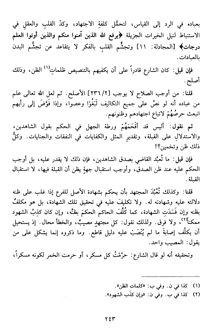 قلنا:وكذلك تعبد المجتهد بأن يحكم بشهادة الأصل للفرع إذا غلب على ظنه دلالته عليه وشهادته له ولا تكليف عليه في تحقيق تلك الشهادة بل هو مكلف بظنه وإن فسدت الشهادة كما كلف الحاكم الحكم بظنه وإن كان كذب الشهود ممكنا ولا فرق ولذلك نقول كل مجتهد مصيب والخطأ محال إذ يستحيل أن يكلف إصابة ما لم ينصب عليه دليل قاطع وما ذكروه إنما يشكل على من يقول المصيب واحد