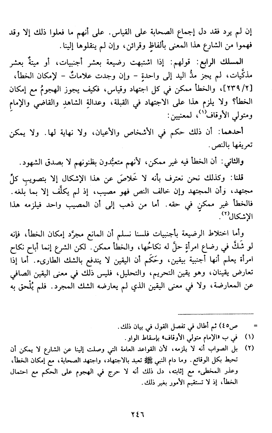 الشبهة الرابعة قولهم إذا اشتبهت رضيعة بعشر أجنبيات أو ميتة بعشر مذكيات لم يجز مد اليد إلى واحدة وإن وجدت علامات لأمكان الخطأ والخطأ ممكن في كل اجتهاد وقياس فكيف يجوز الهجوم مع إمكان الخطأ ولا يلزم هذا على الاجتهاد في القبلة وعدالة الشاهد والقاضي والإمام ومتولي الأوقاف لمعنيين: