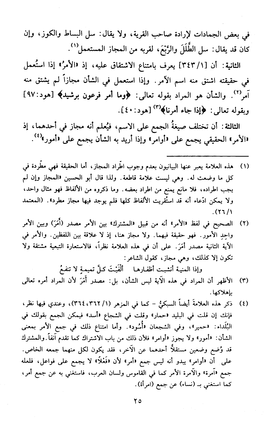 الثانية: أن يعرف بامتناع الاشتقاق عليه إذ الأمر إذا استعمل في حقيقته اشتق منه اسم الآمر وإذا استعمل في الشأن مجازا لم يشتق منه آمر والشأن هو المراد بقوله تعالى { وَمَا أَمْرُ فِرْعَوْنَ بِرَشِيدٍ} [هود: من الآية97]وبقوله تعالى { إِذَا جَاءَ أَمْرُنَا} [هود: من الآية40]