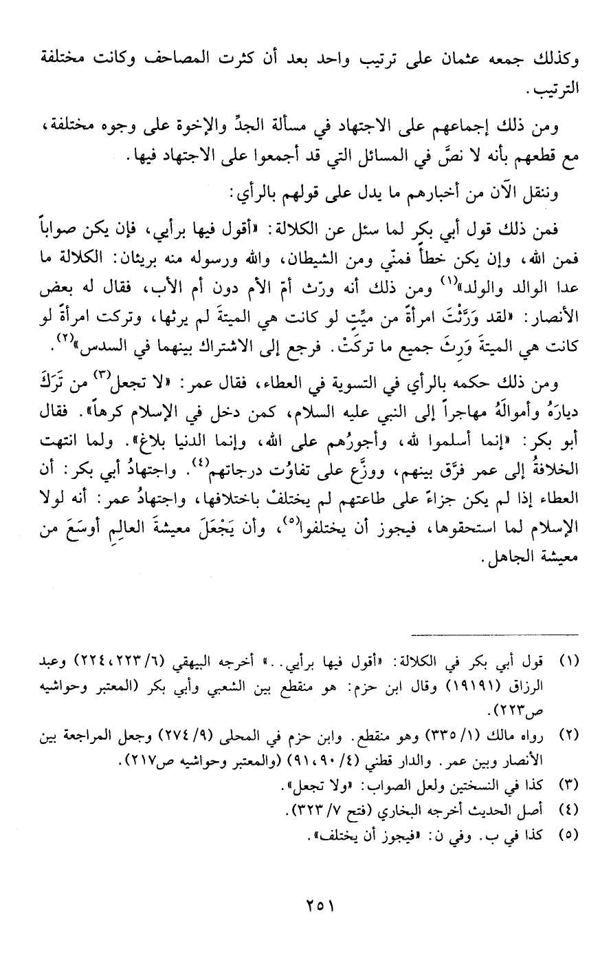 فمن ذلك قول أبي بكر لما سئل عن الكلالة أقول فيها برأيي فإن يكن صوابا فمن الله وإن يكن خطأ فمني ومن الشيطان والله ورسوله منه بريئان الكلالة ما عدا الوالد والولد ومن ذلك أنه ورث أم الأم دون أم الأب فقال له بعض الأنصار لقد ورثت امرأة من ميت لو كانت هي الميتة لم يرثها وتركت امرأة لو كانت هي الميتة ورث جميع ما تركت فرجع إلى الاشتراك بينهما في السدس